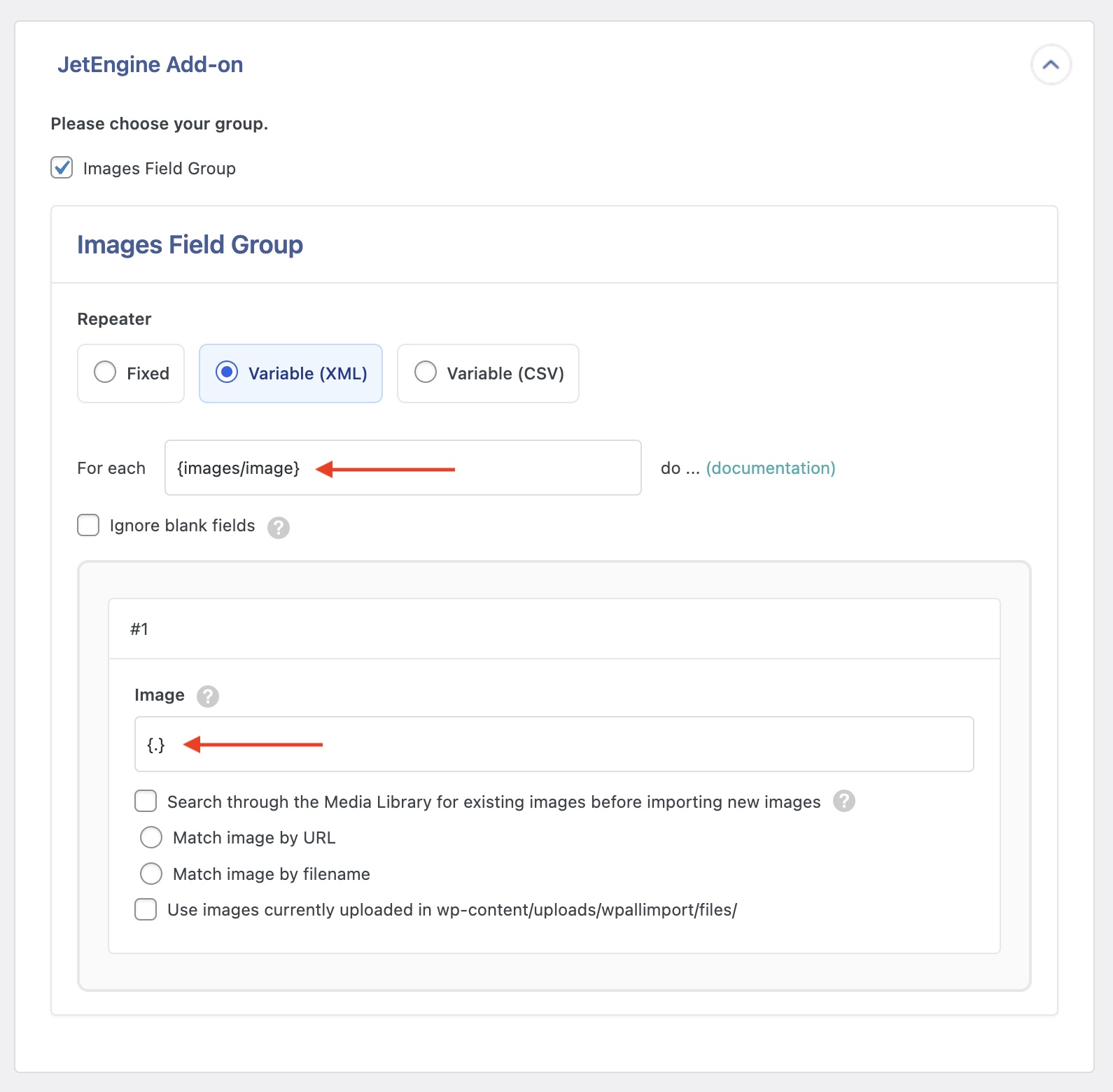 Check the Ignore blank fields checkbox if some of the records in your file don’t contain values for its image. For example, if image_3 and onwards are blank for a certain record, WP All Import will only add two rows to the repeater.