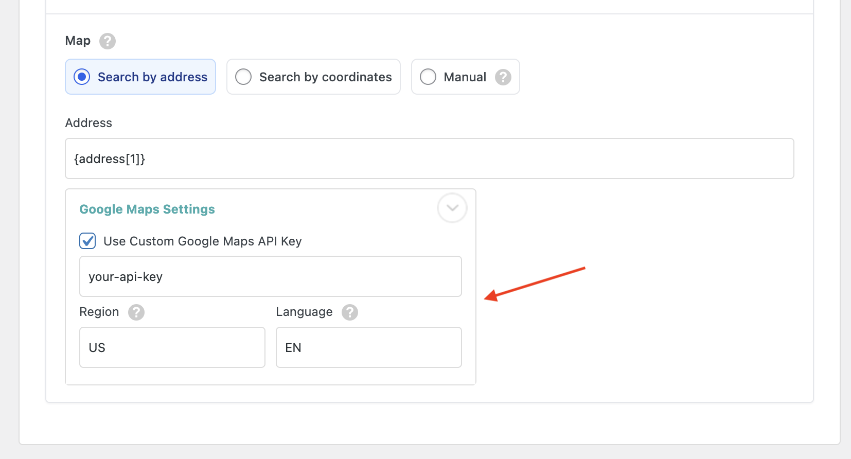 You can enable the checkbox Use Custom Google Maps API Key to use Google Geocoding services when available. Once enabled, you can input your Google Maps API Key in the field.