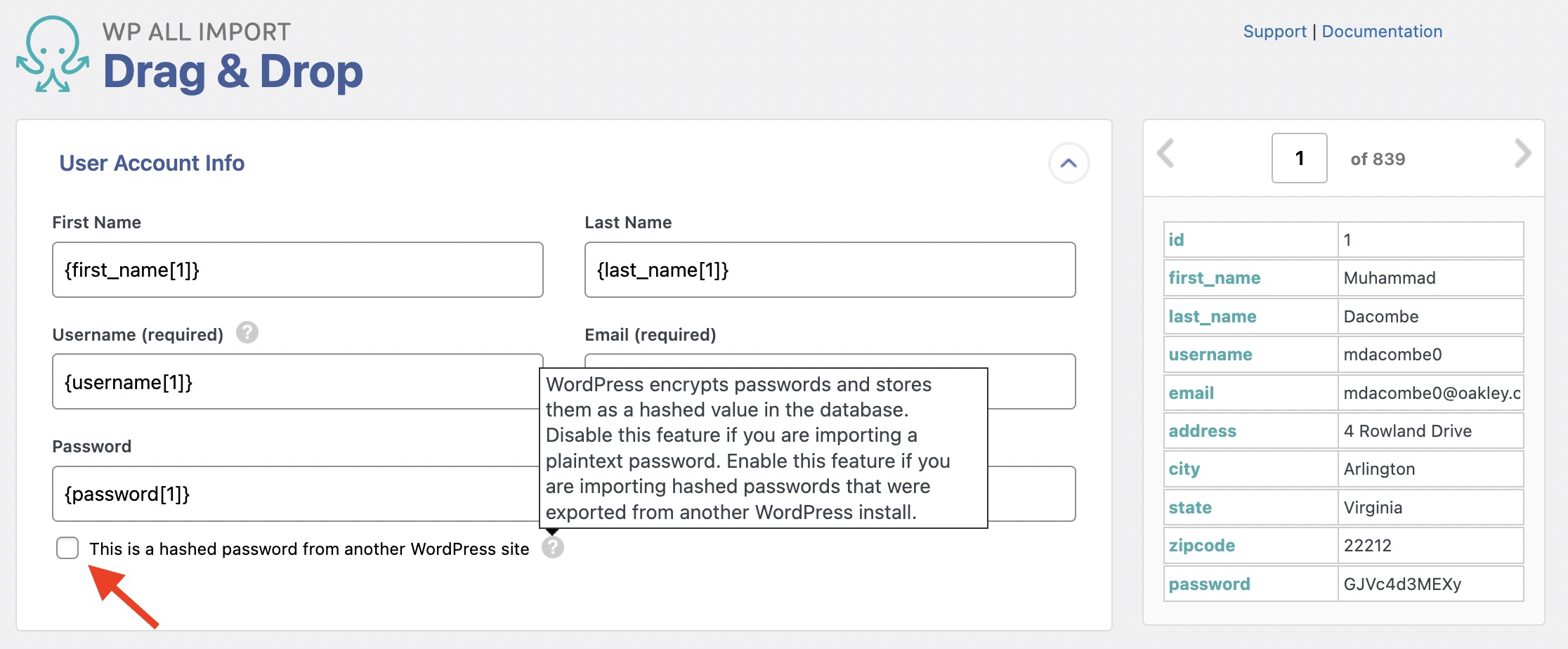 If you do receive a user import file that contains a plaintext password, no problem. WP All Import can handle this, too. You just have to disable the This is a hashed password from another WordPress site checkbox, as shown in the previous image.