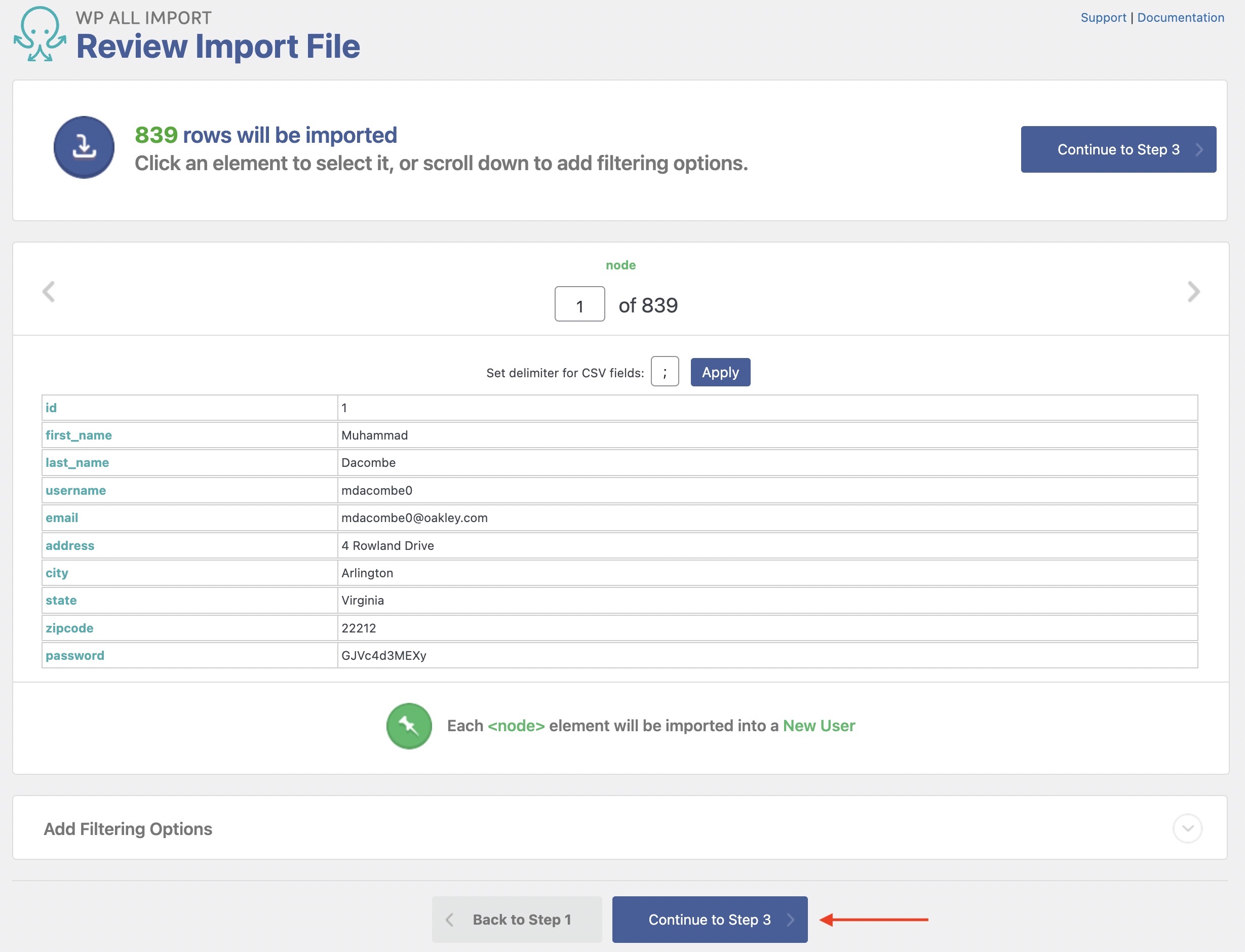 You can view the user information here. The import has detected 839 records. You can use the gray arrows to navigate between these records.