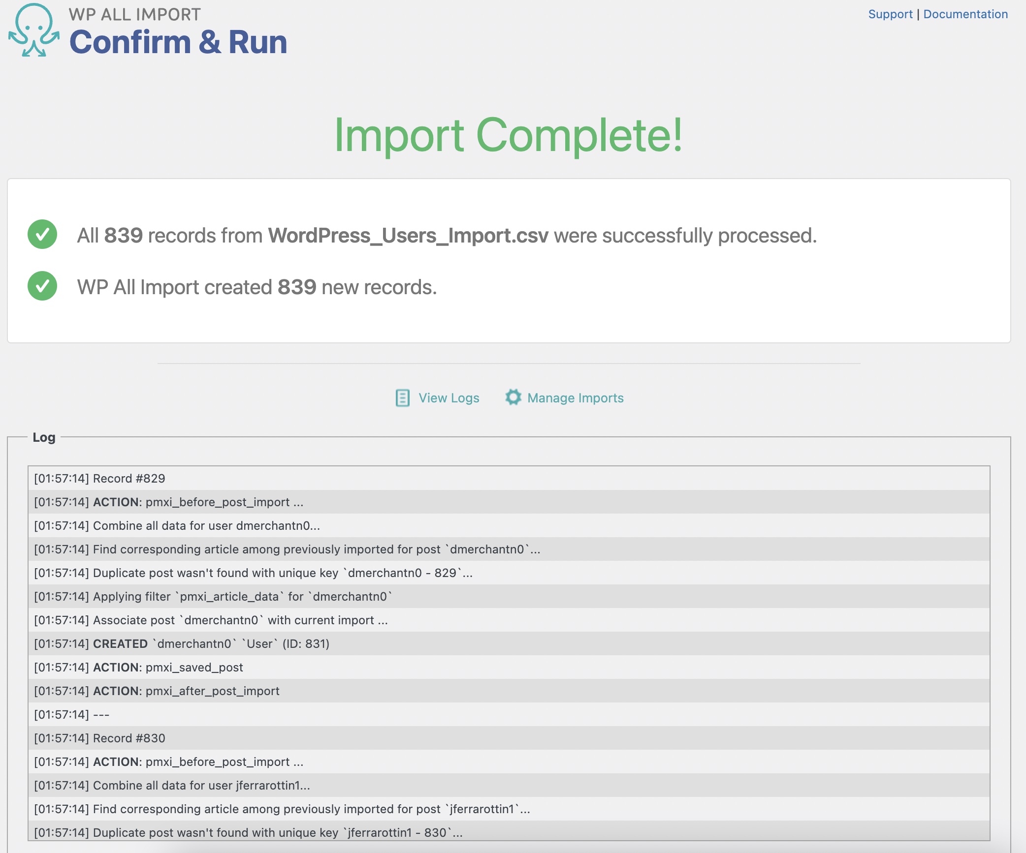 Click Confirm & Run Import to run the import. When it completes, you will see this screen: