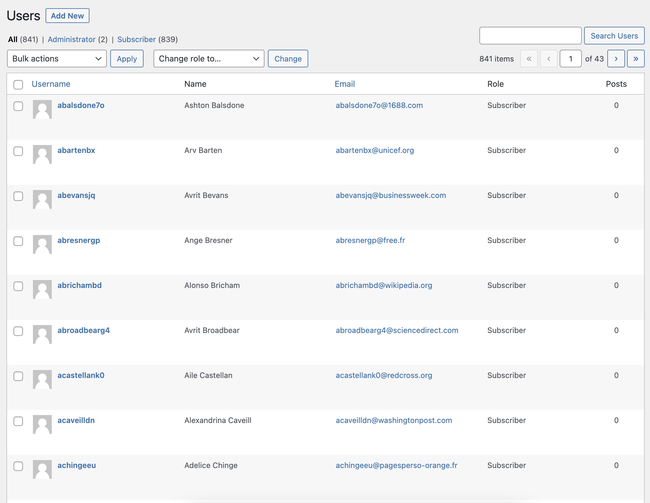This means that the import was completed successfully. To confirm that everything worked as expected, navigate to Users › All Users in the WordPress main menu. There, you should see all of your imported users: