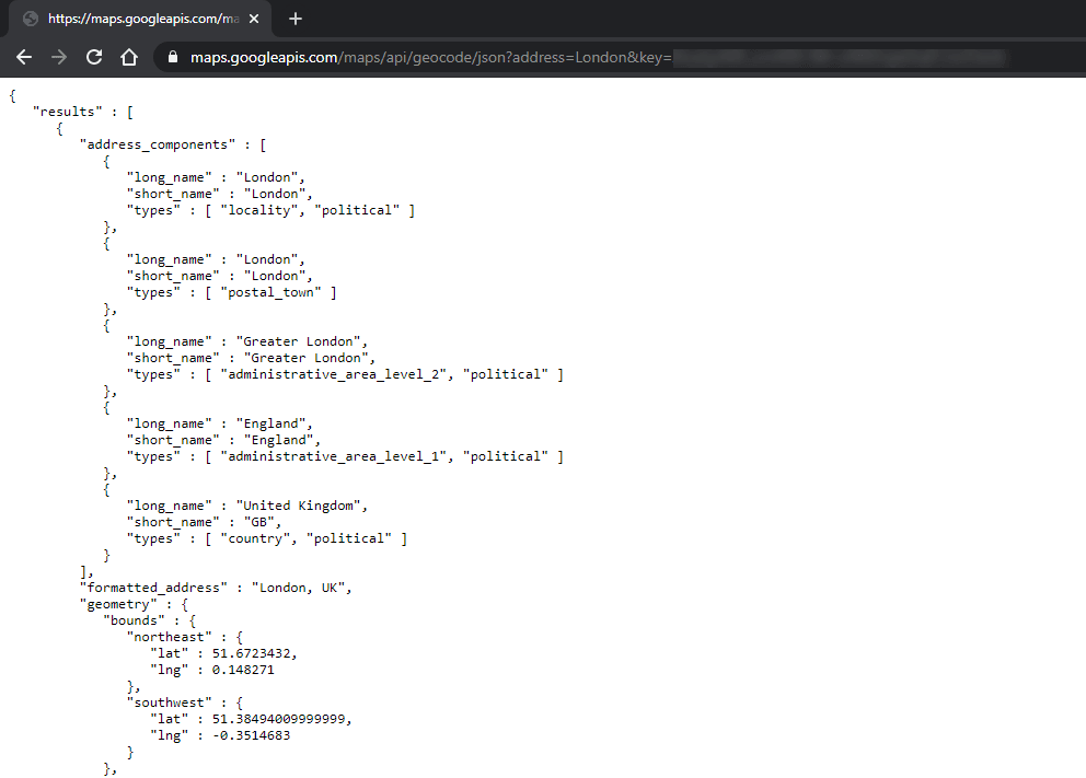 Replace YOUR_API_KEY with your Google API key, then visit the URL in your web browser. If you see address data, then you'll know it's working.