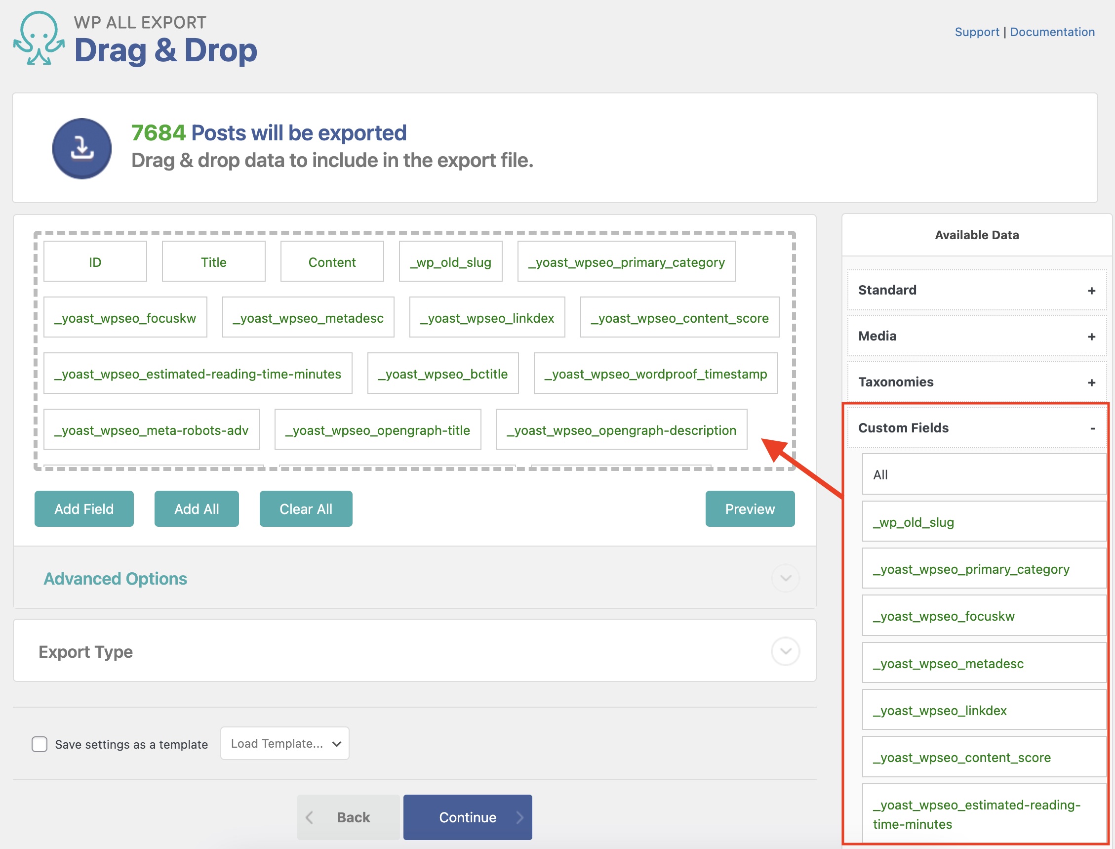 To select fields for export, drag them from the right and drop them on the left. Here, we are exporting custom fields from the Yoast WordPress SEO plugin. The custom fields associated with your theme plugin may be different, but they will be automatically detected and accessible in Available Data › Custom Fields: