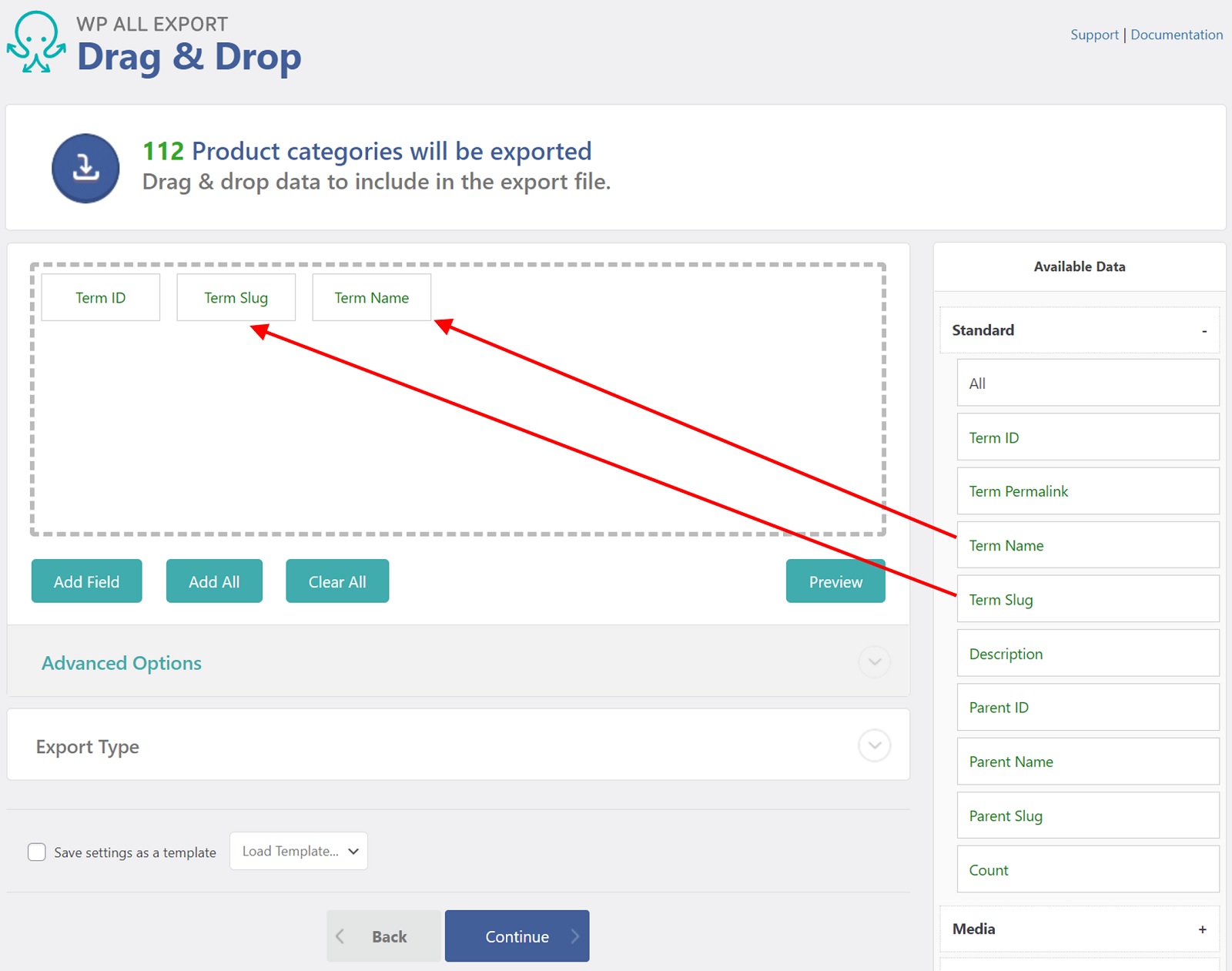 To export taxonomy terms in WordPress, you must first select the taxonomy subtype that you want to export (e.g., Categories). Then, in the Drag & Drop screen, simply drag the term fields from the Available Data > Standard section into the column selection area.