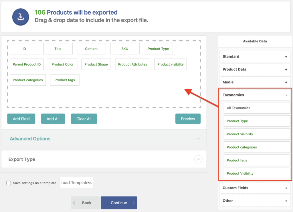 - Include Available Data > Taxonomies > Product categories in your export fields.