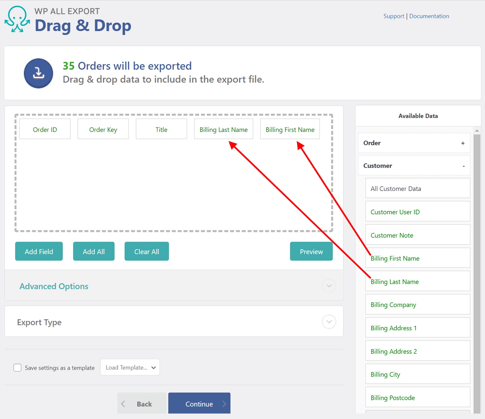To export order details in WooCommerce, expand the appropriate section in Available Data in the Drag & Drop screen, then just drag and drop the desired fields into the column selection area. For example, if you want to export the product details associated with an order, select fields from the Available Data > Items section.