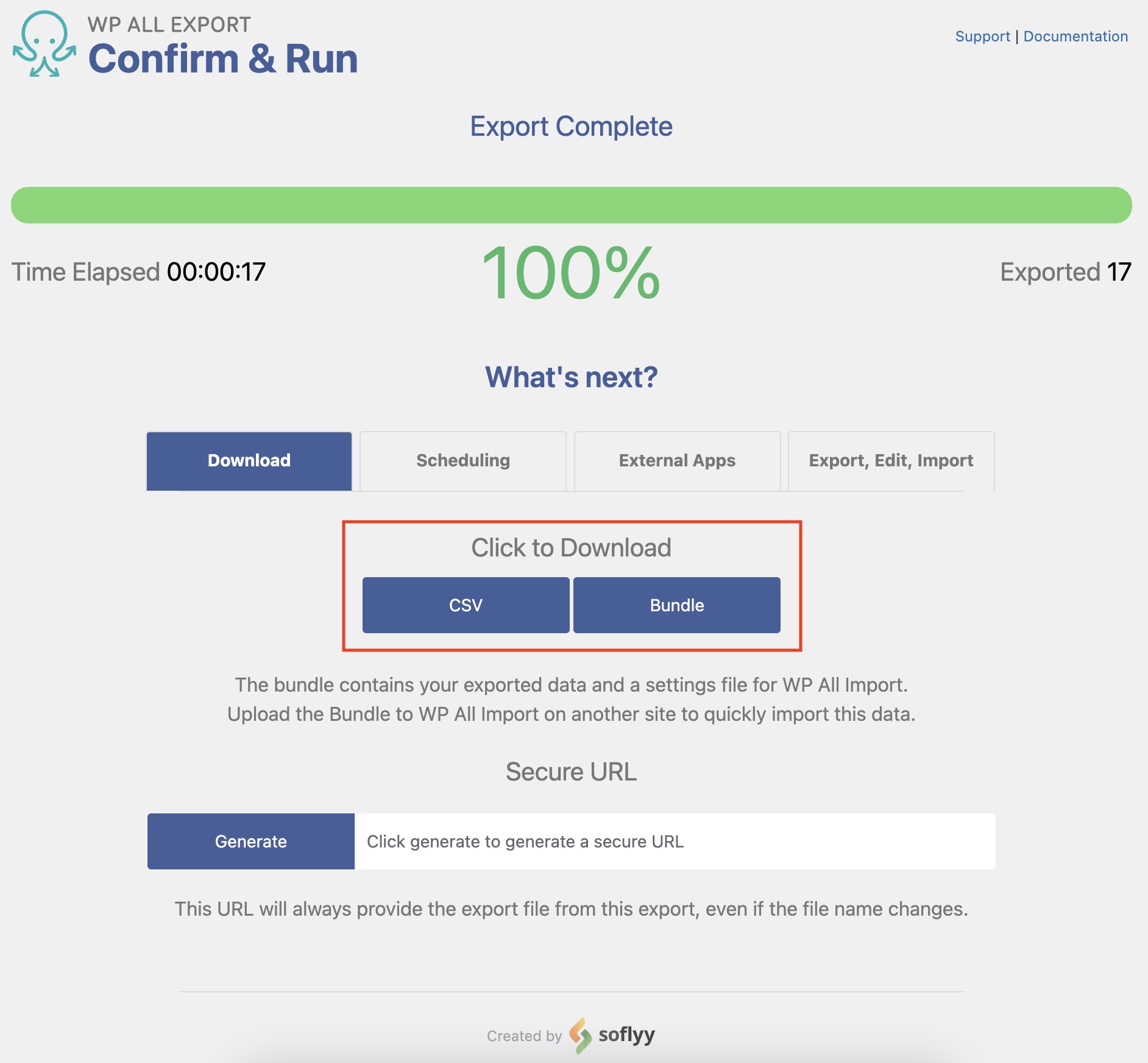Once the export finishes, you'll see the Export Complete screen. Here, you can Click to Download the exported WooCommerce coupons, as well as access other options within WP All Export.