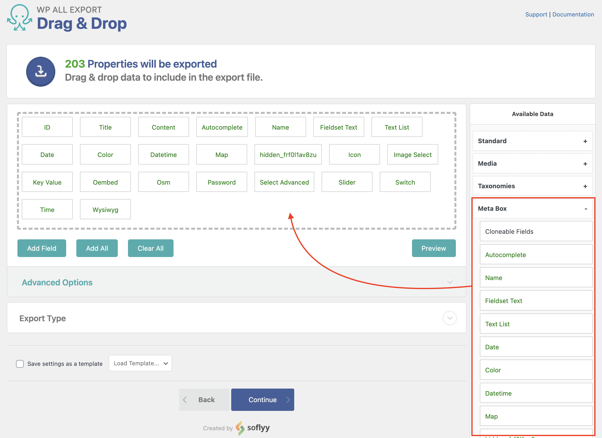 To export Meta Box cloneable fields, navigate to All Export › New Export, select the post type with attached Meta Box cloneable fields, and then customize the export template. You can drag & drop the Meta Box fields from Available Data › Meta Box.