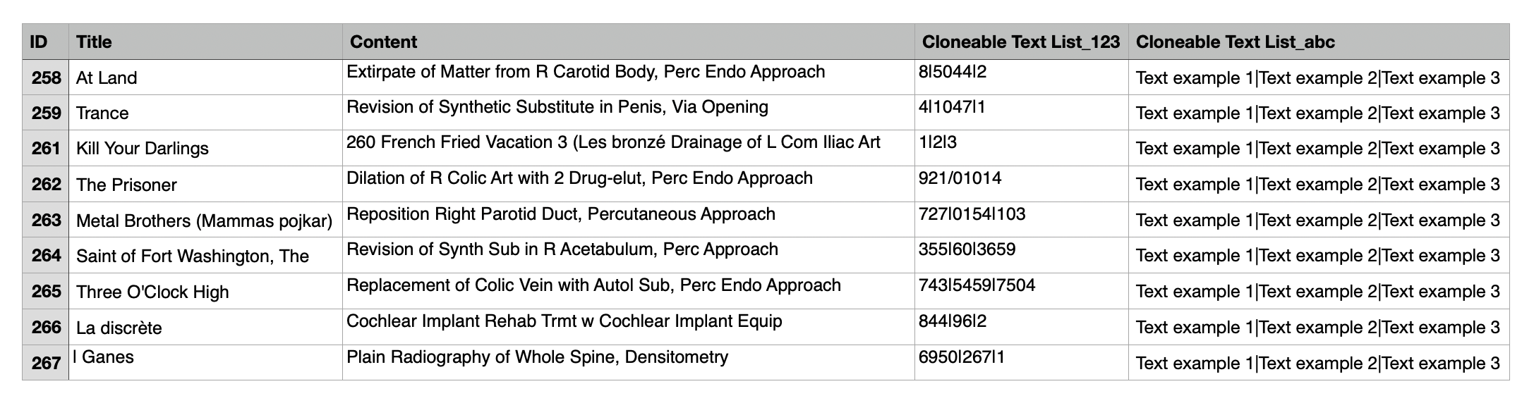 - A cloneable text column that contains all repeated text strings separated by a pipe ( | ) character.