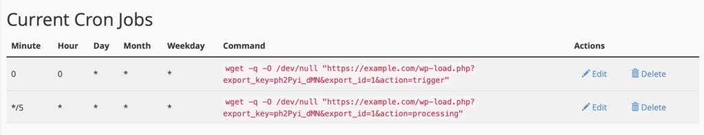 curl --silent "https://example.com/wp-load.php?export_key=ph2Pyi_dMN&export_id=1&action=processing&rand="$RANDOM > /dev/nullAs seen in these examples, we use a $RANDOM parameter as a cache-busting technique. This is particularly handy in servers where heavy caching doesn't allow the cron jobs to function correctly.