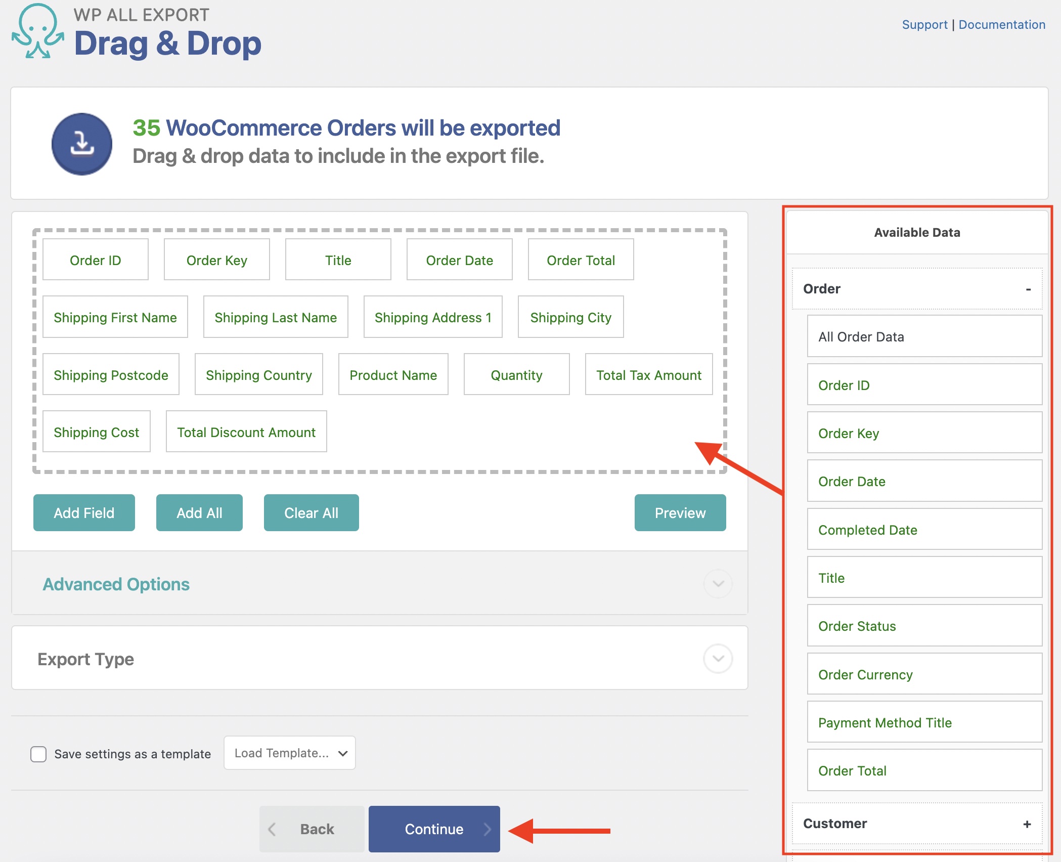 In this screen, add and rearrange data columns that you wish to include in your export file.