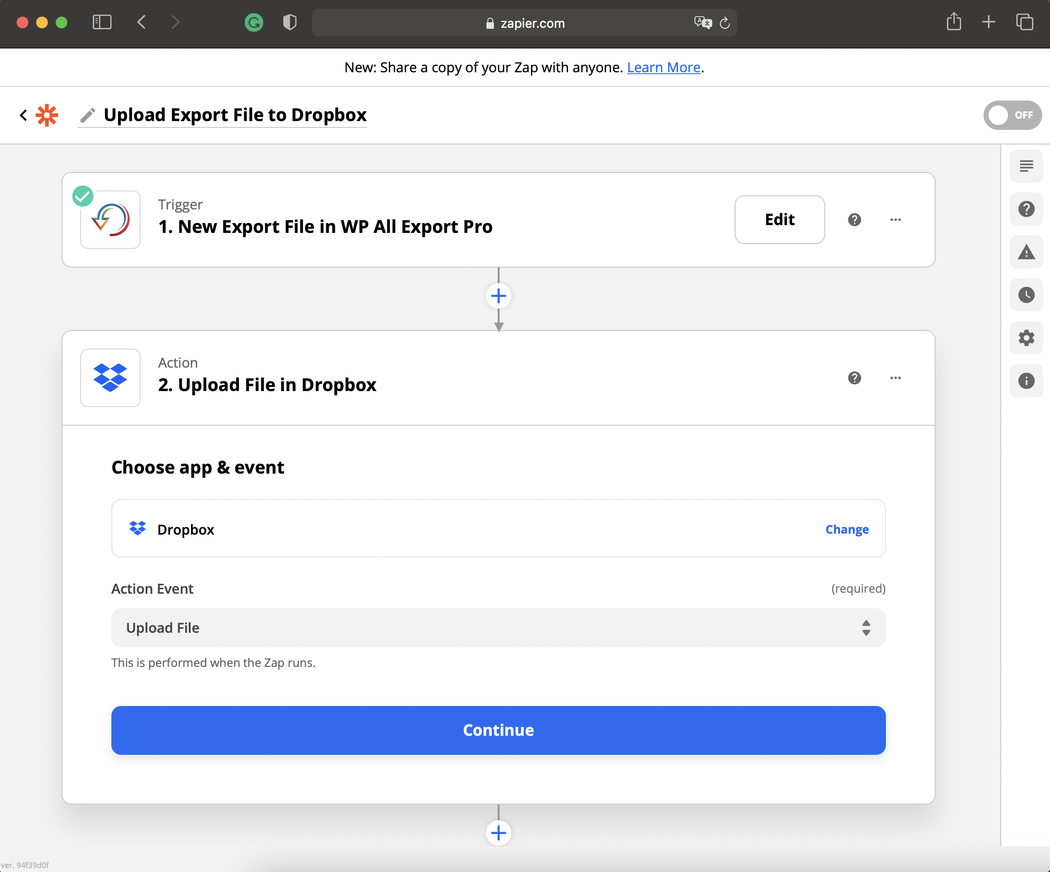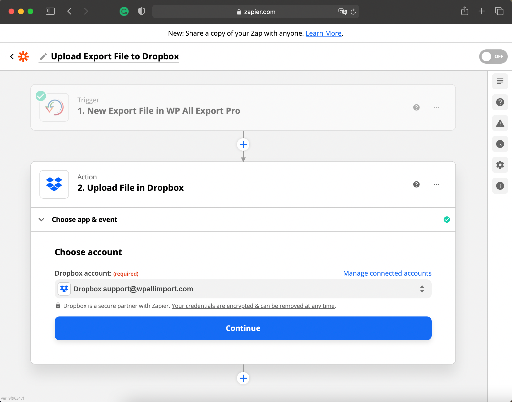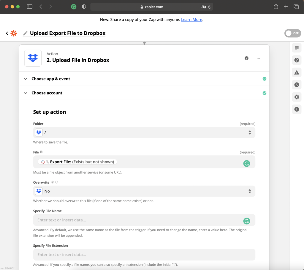 In this step, Zapier connects to the Dropbox account where the export file will be uploaded.