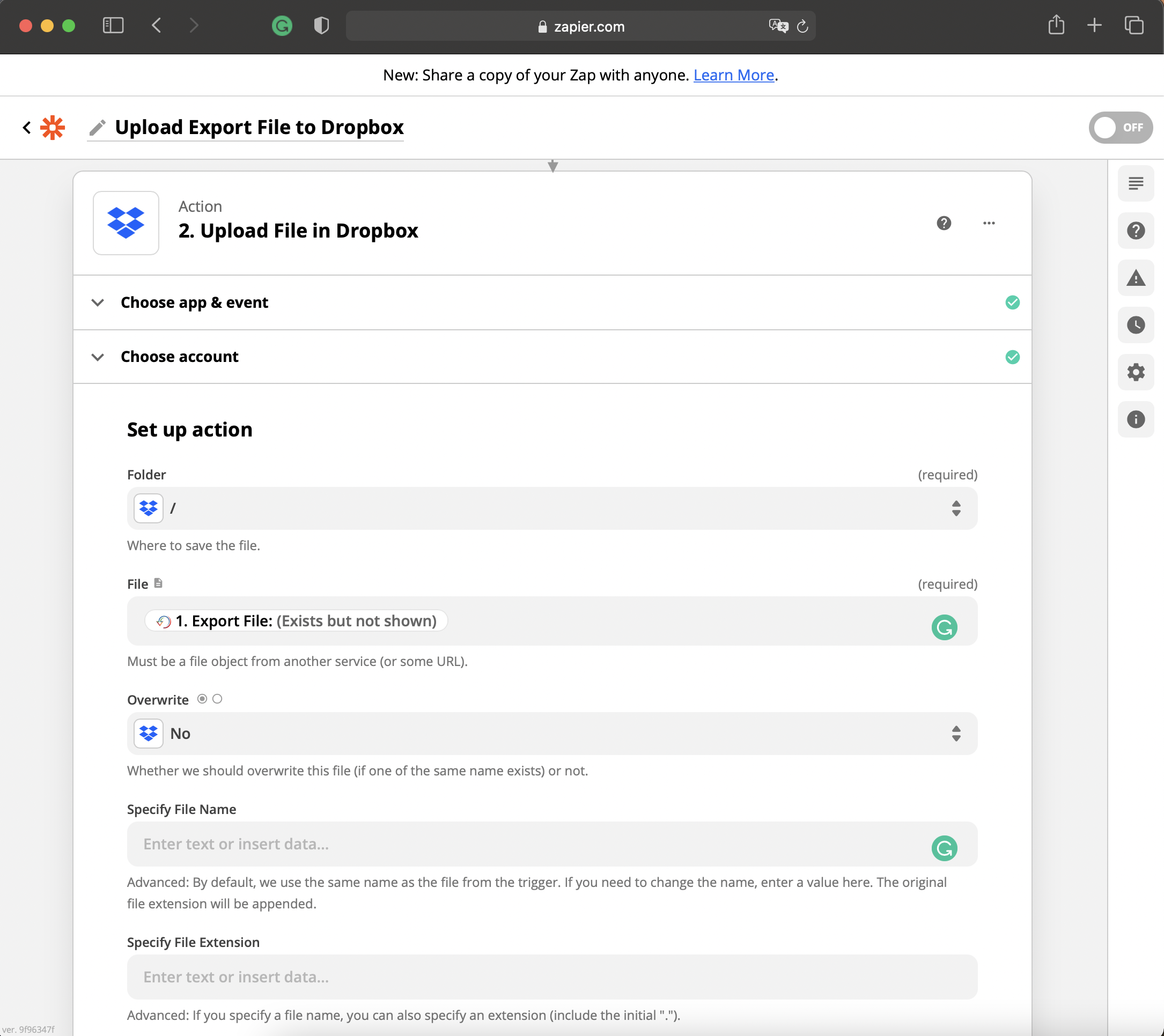 - Overwrite: If there's an existing file with the same name, should Zapier overwrite it? Defaults to No.