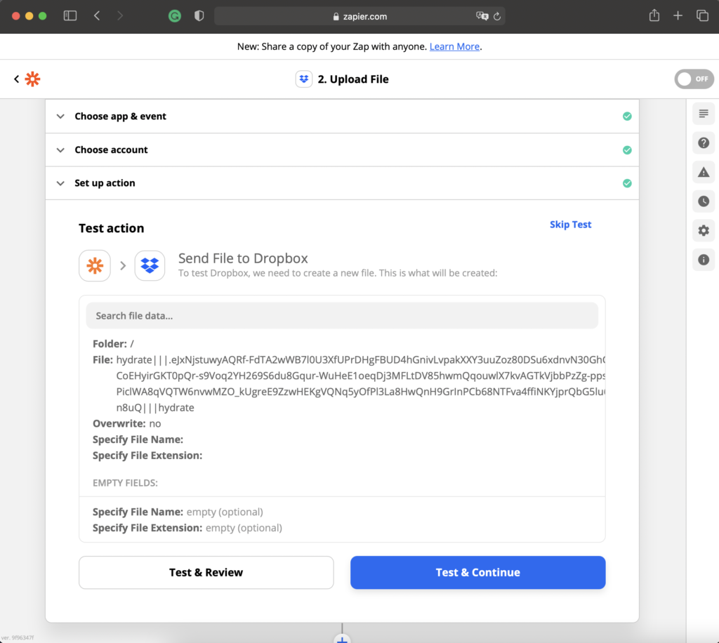 After the Dropbox action is configured, Zapier will attempt to test it. Click Skip Test to avoid this step, or click Test & Continue to proceed.