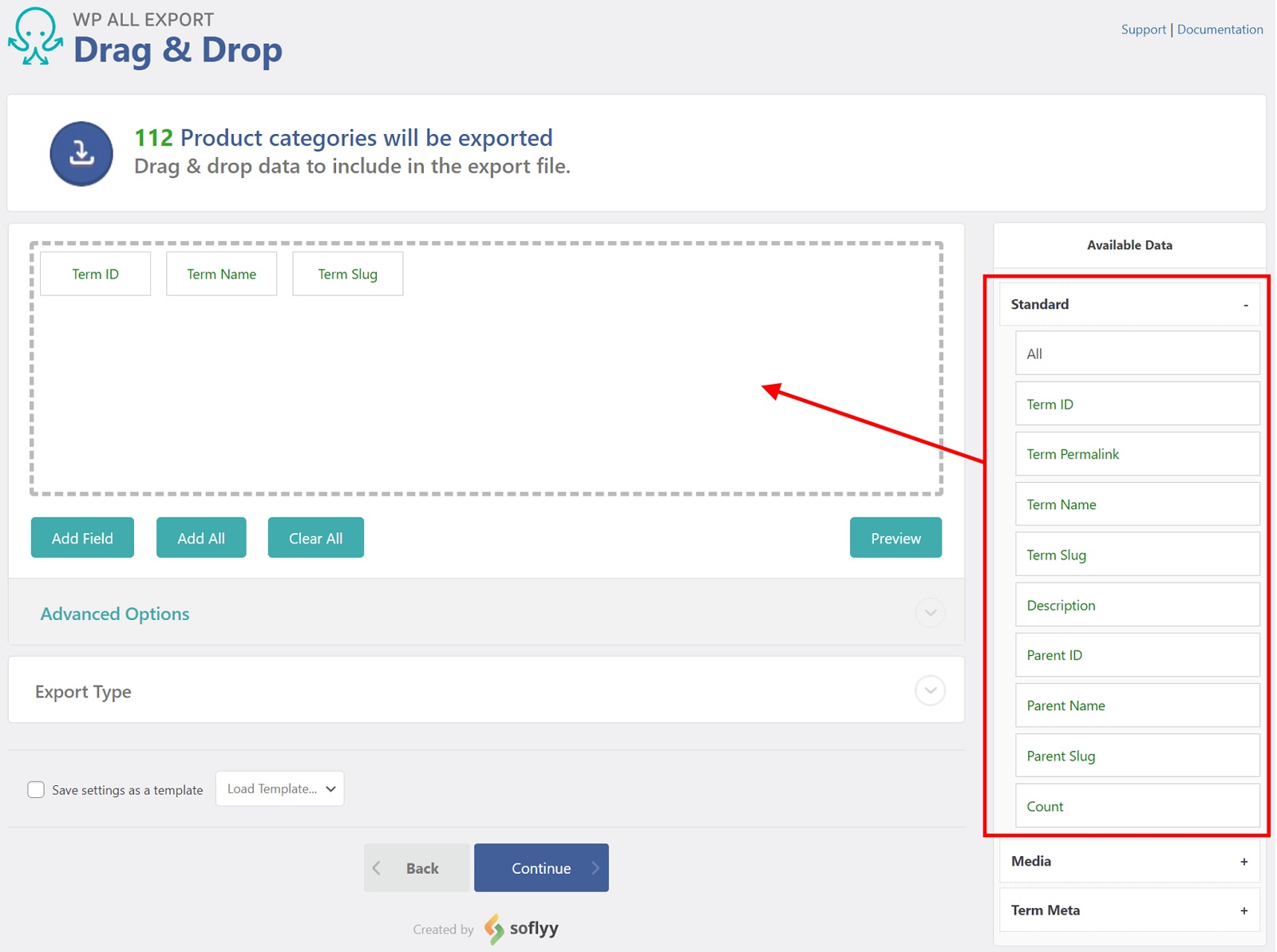 - Select Taxonomies as the export post type, followed by Product categories as the subtype.