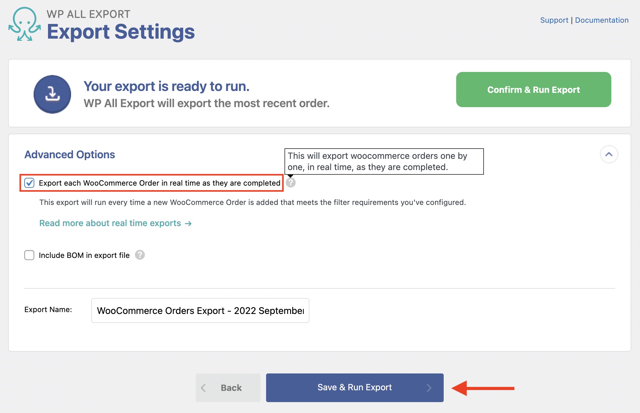 - In the Advanced Options section of the Export Settings screen, enable Export each WooCommerce Order in real time as they are completed.