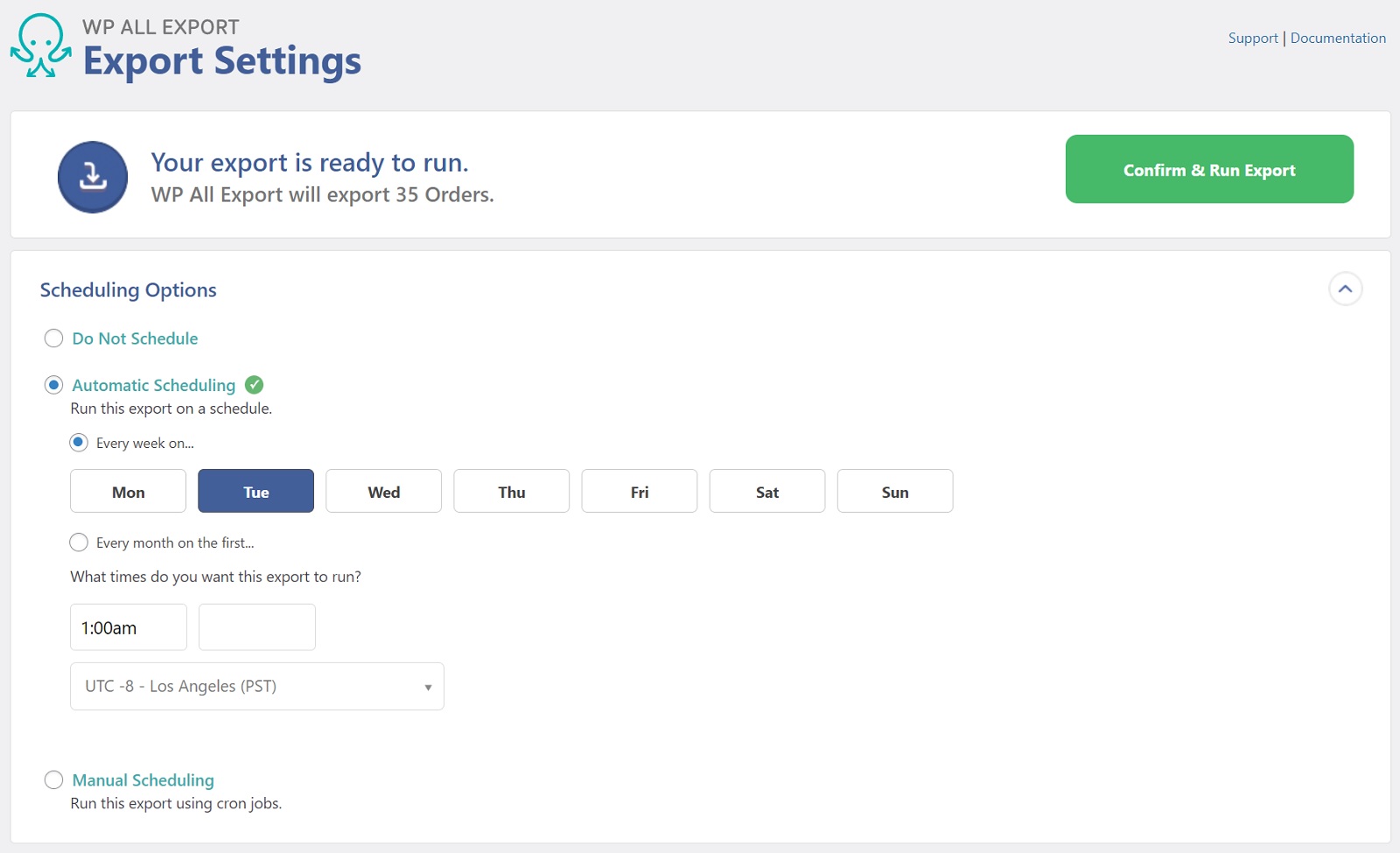 - In the Scheduling Options section of the Export Settings screen, set your export to run once per week.