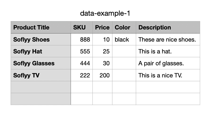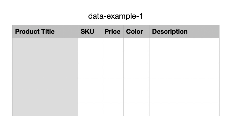 Use your favorite spreadsheet software such as Google Sheets, Apple Numbers, or Microsoft Excel. Create a new spreadsheet and define your import columns, such as product title, SKU, price, color, and description.