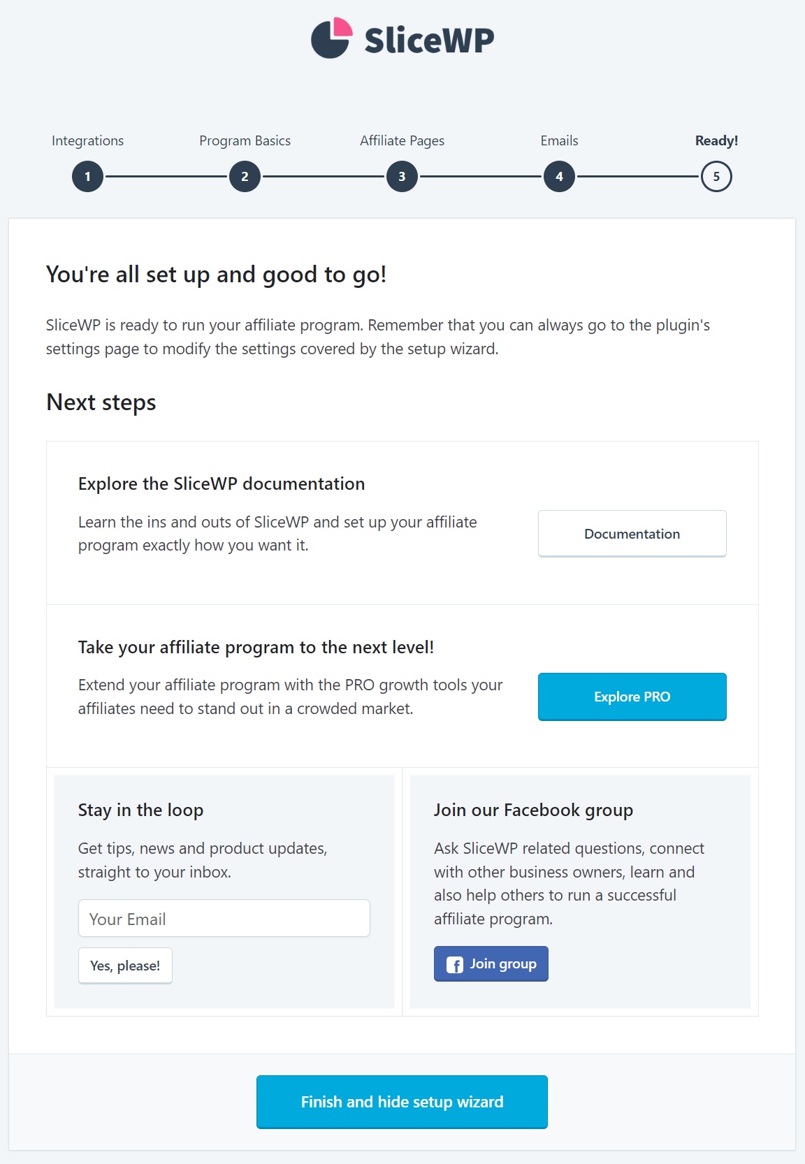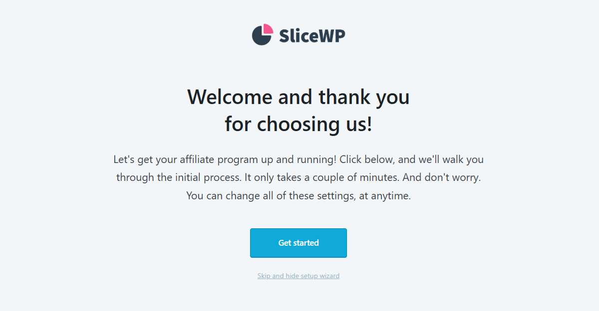 After you've installed and activated the SliceWP plugin, the setup wizard automatically starts and guides you through the essential configuration steps.