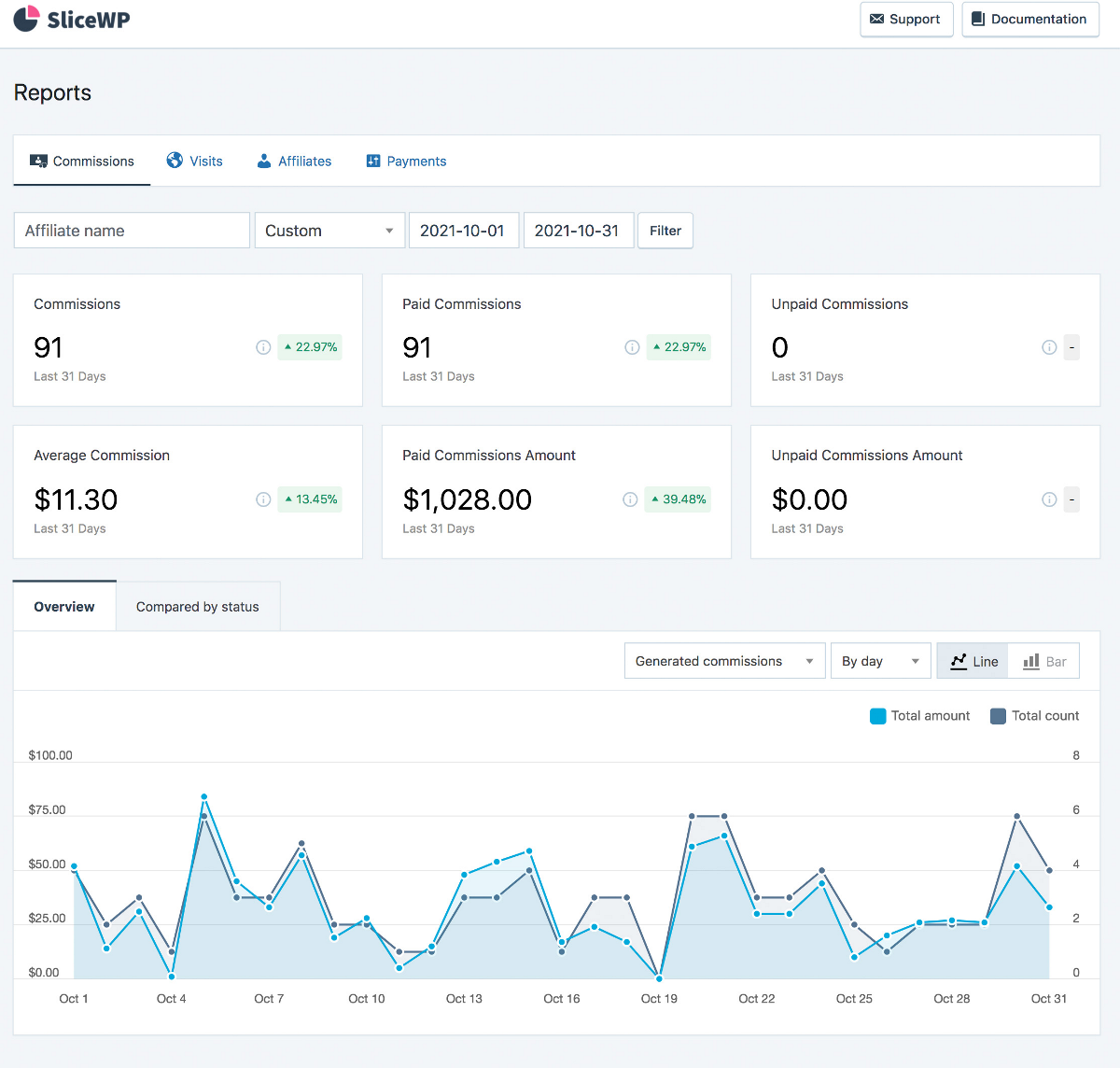For a deeper analysis of your program’s performance, you can access real-time reports that allow you to track trends over time by filtering data by specific date ranges. You can also filter by individual affiliates, making it easy to identify who your top performers are.