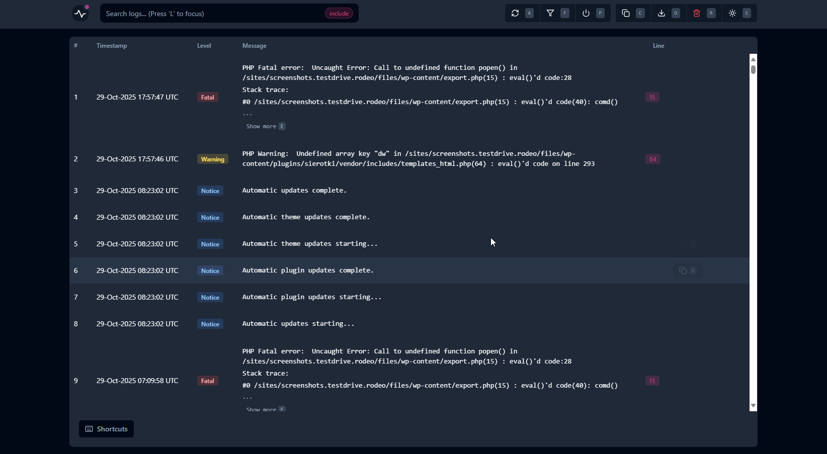 What makes it really useful is the log viewer app that works independently of WordPress. The clean interface shows all your errors in one place, with filters to help you find specific issues fast. The built-in file viewer shows exactly where each error occurred in your code, so you don't have to guess.