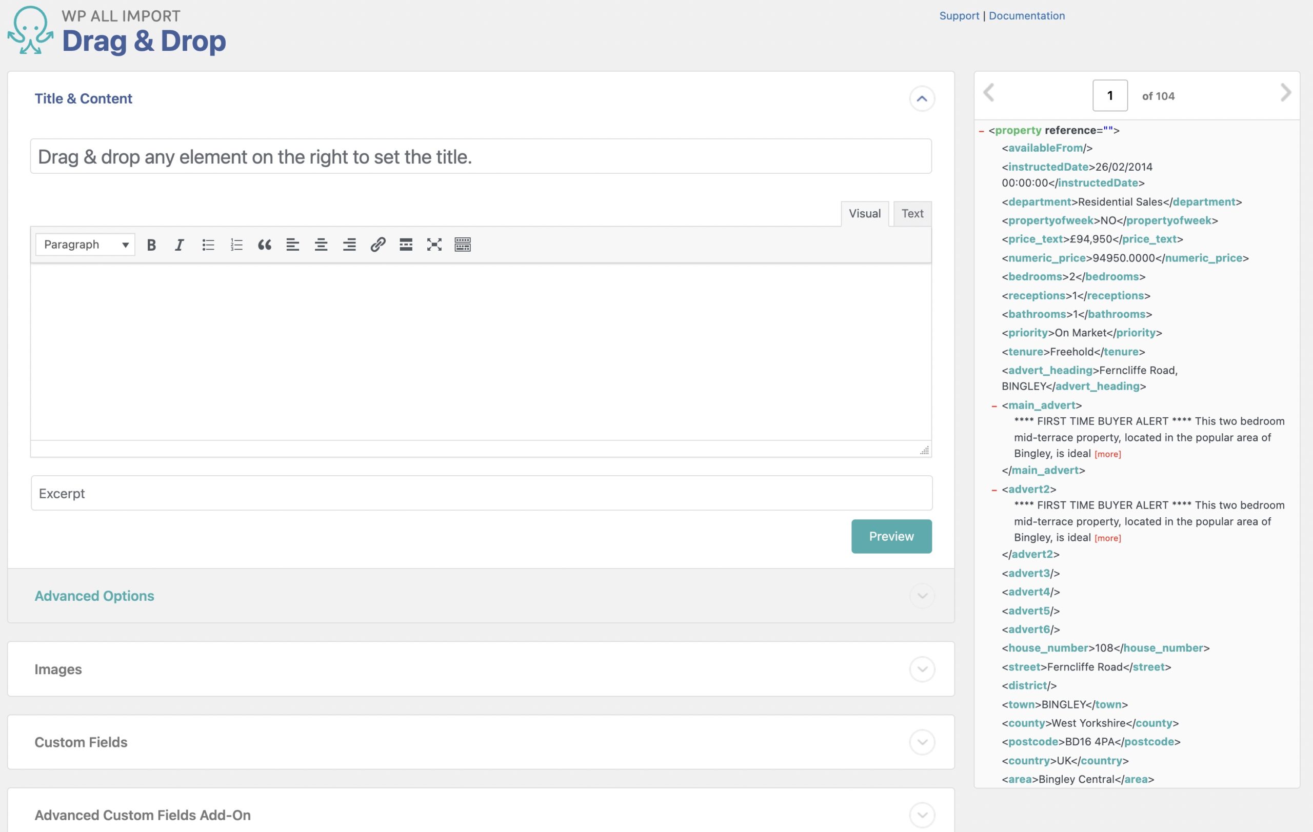 To import any CSV, XML, Excel, or Google Sheets file into WordPress, simply map the incoming data elements to their corresponding WordPress fields by using our convenient drag & drop tool. You can filter and even modify the incoming data during the import process.