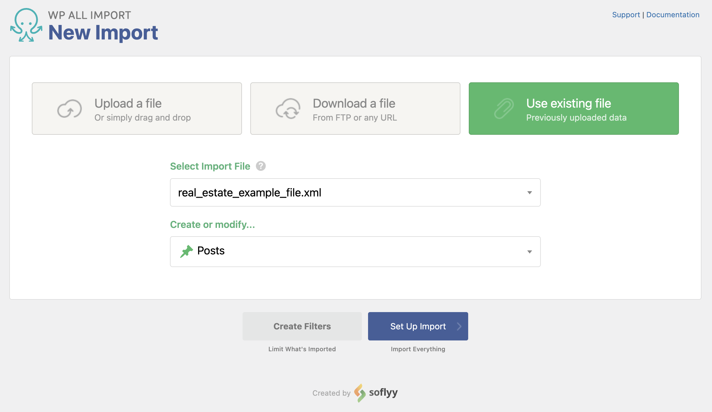 The first step to creating a WordPress import is to upload your import file via All Import › New Import. You can choose to upload the file from your computer, paste in a URL to the file, or choose an existing file that you've already used with WP All Import.