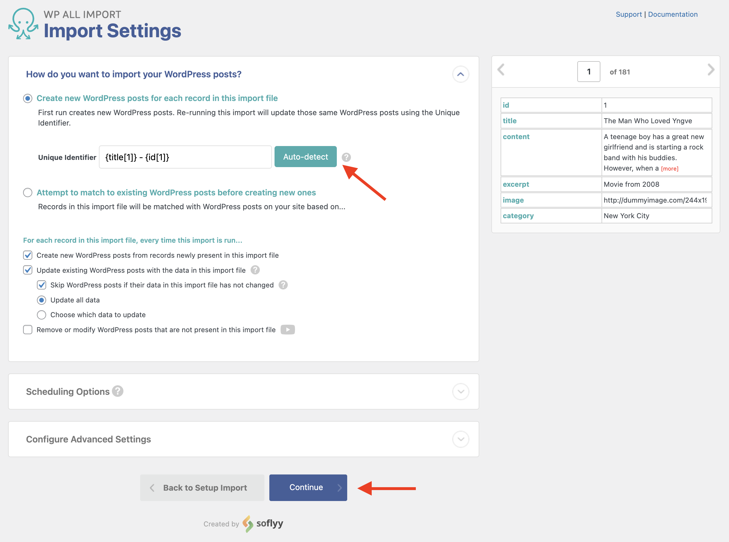 The Import Settings interface is next. Here, you can modify the import configuration and other settings. First of all, click Auto-detect to generate a unique identifier. As the name implies, this identifies unique posts, which helps our plugin to avoid creating duplicates and also update existing posts.