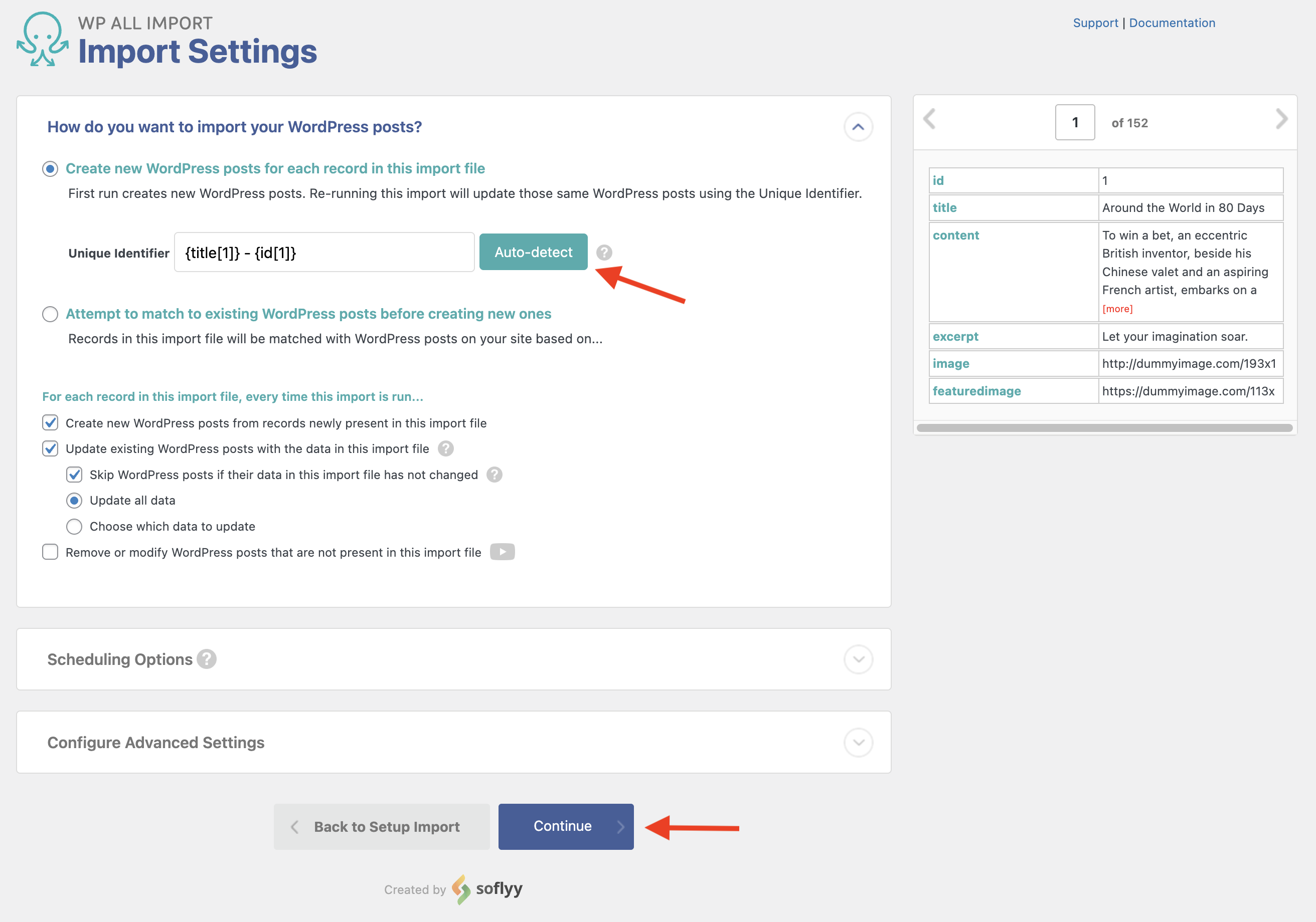 Click on Auto-detect to create a unique identifier, which allows WP All Import to distinguish between posts.