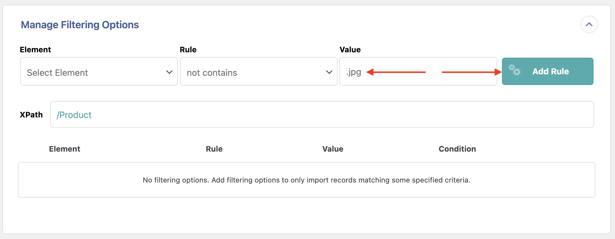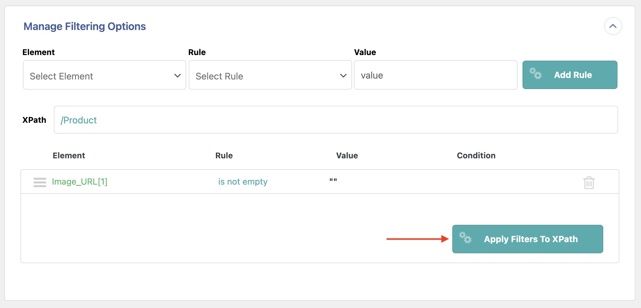 The Rule selection box lets you choose which rule to use for the filter. In this example, we have selected is not empty, meaning we want to import only products where the Image_URL element has data.