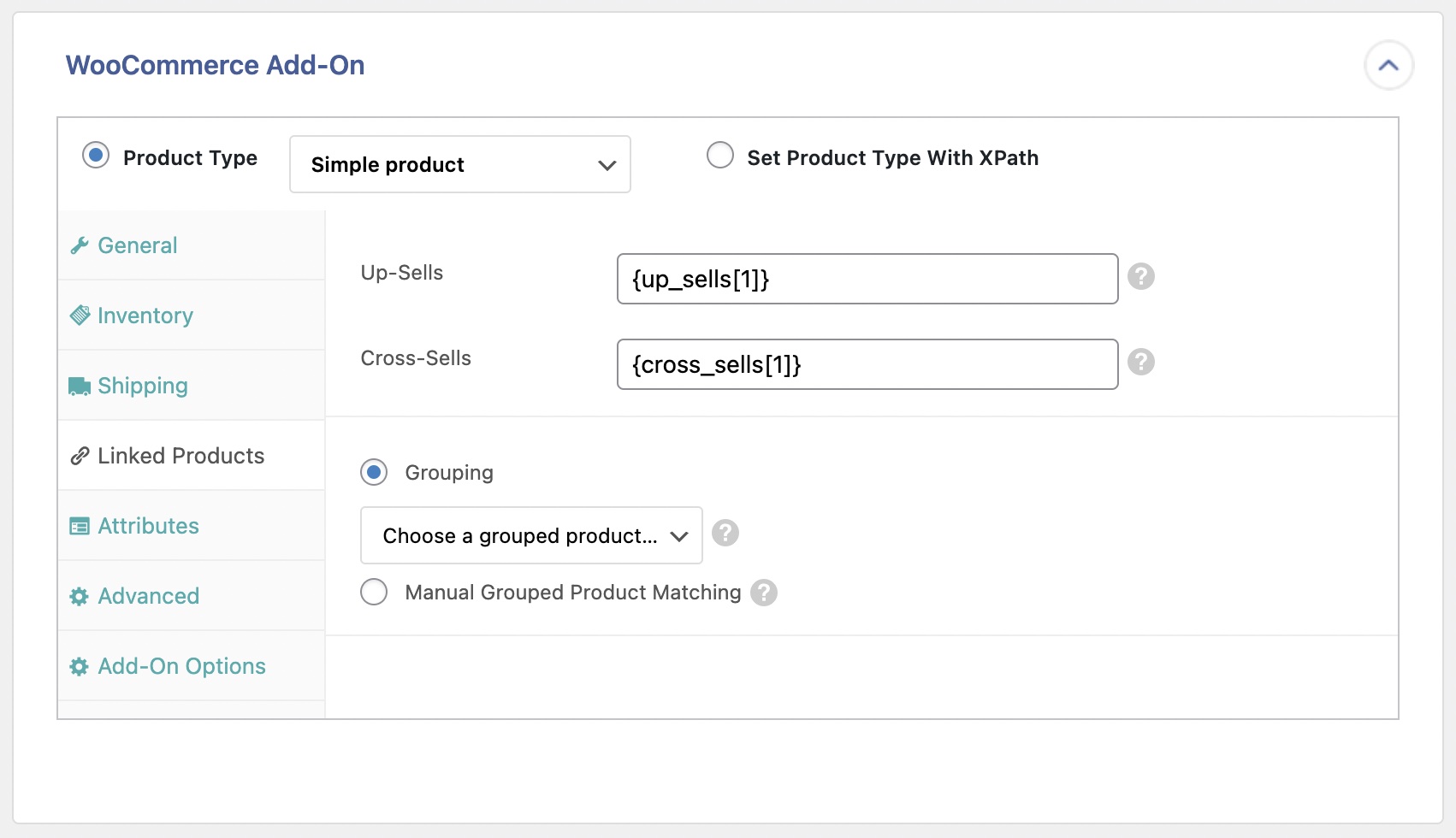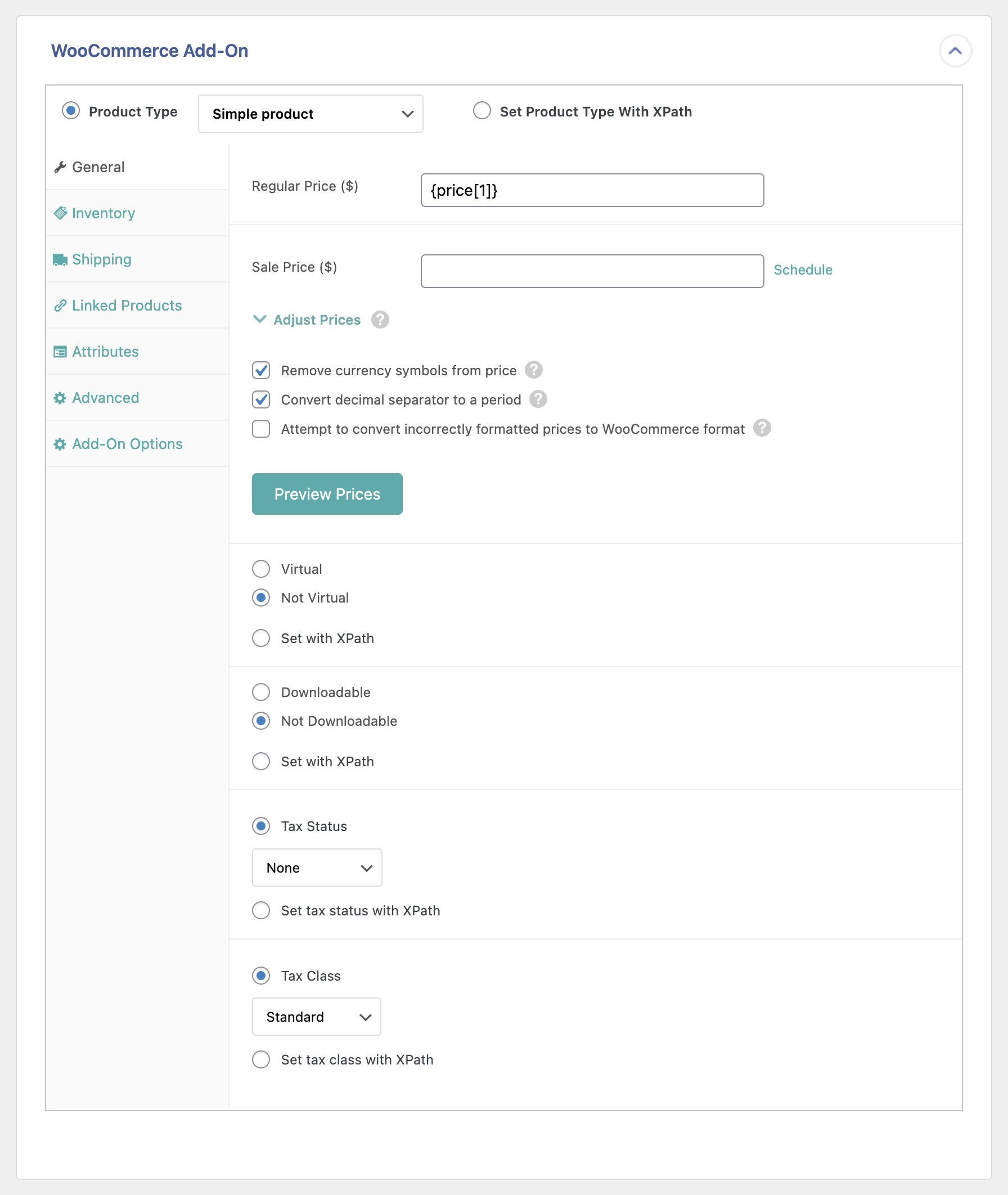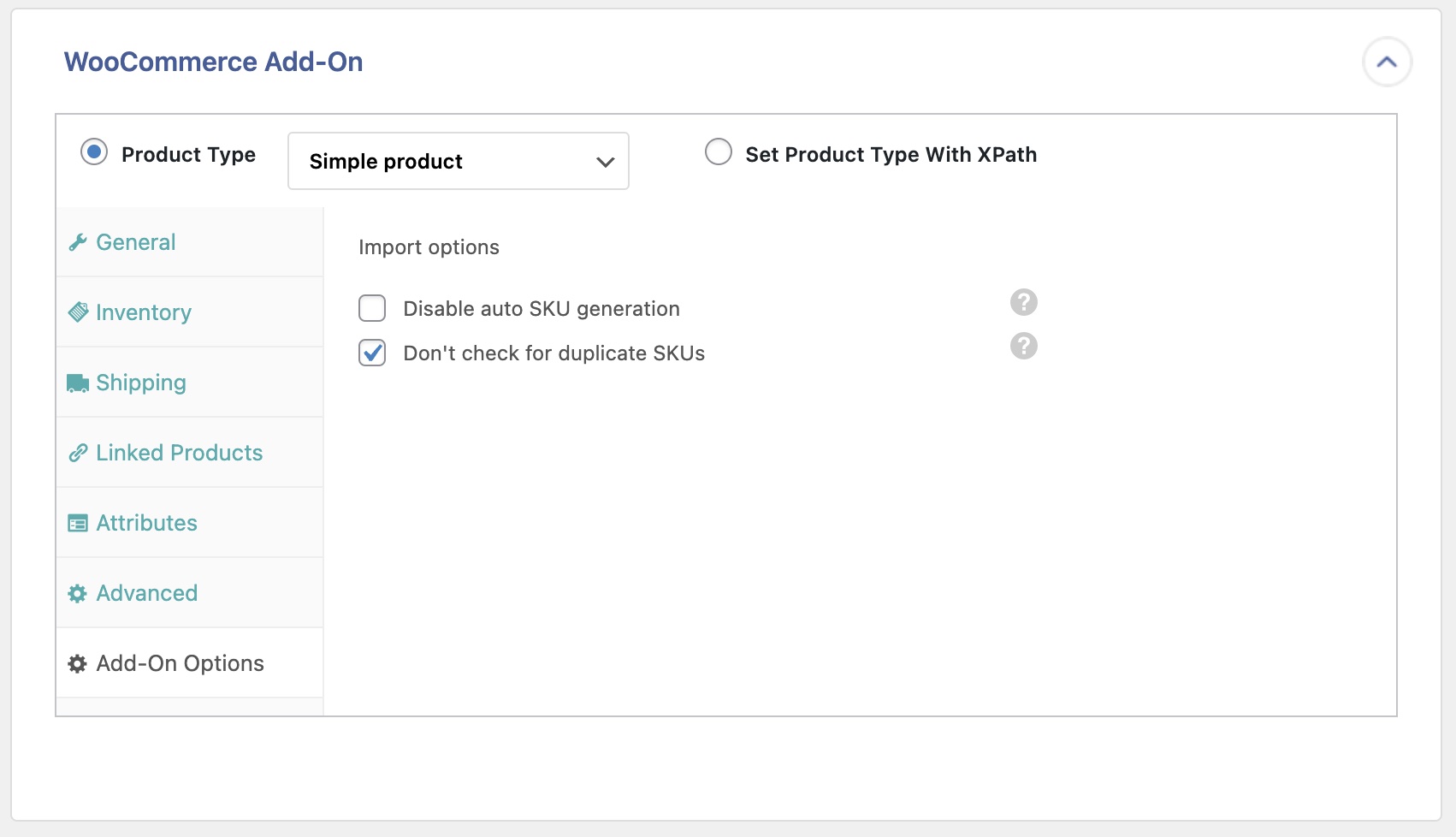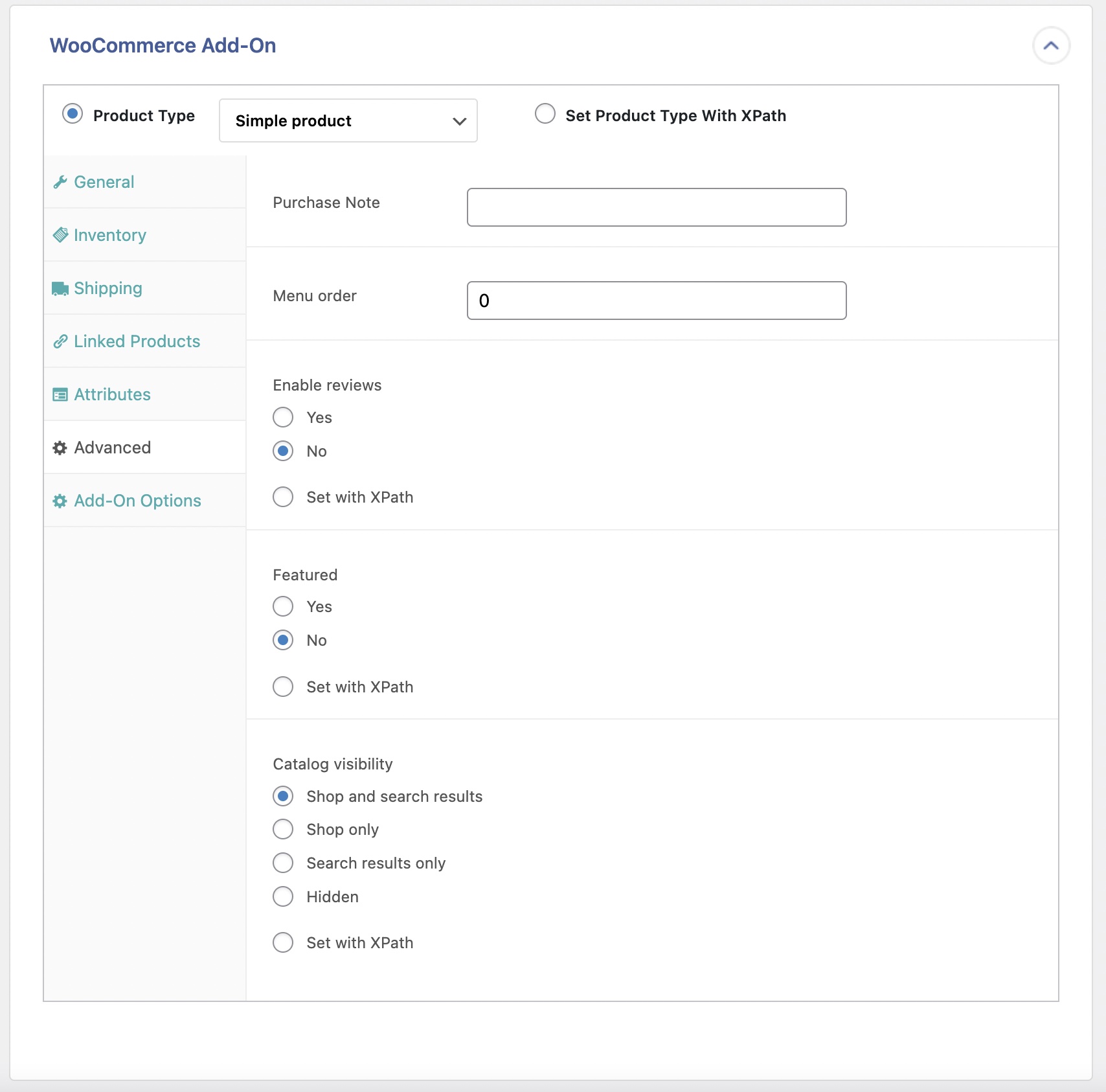This section lets you define the import Product Type. By default, it's set as Simple product, but this can be changed to a different product type. You can also choose to Set Product Type With XPath and use an import element with an accepted product type (i.e., simple, grouped, external, variable).