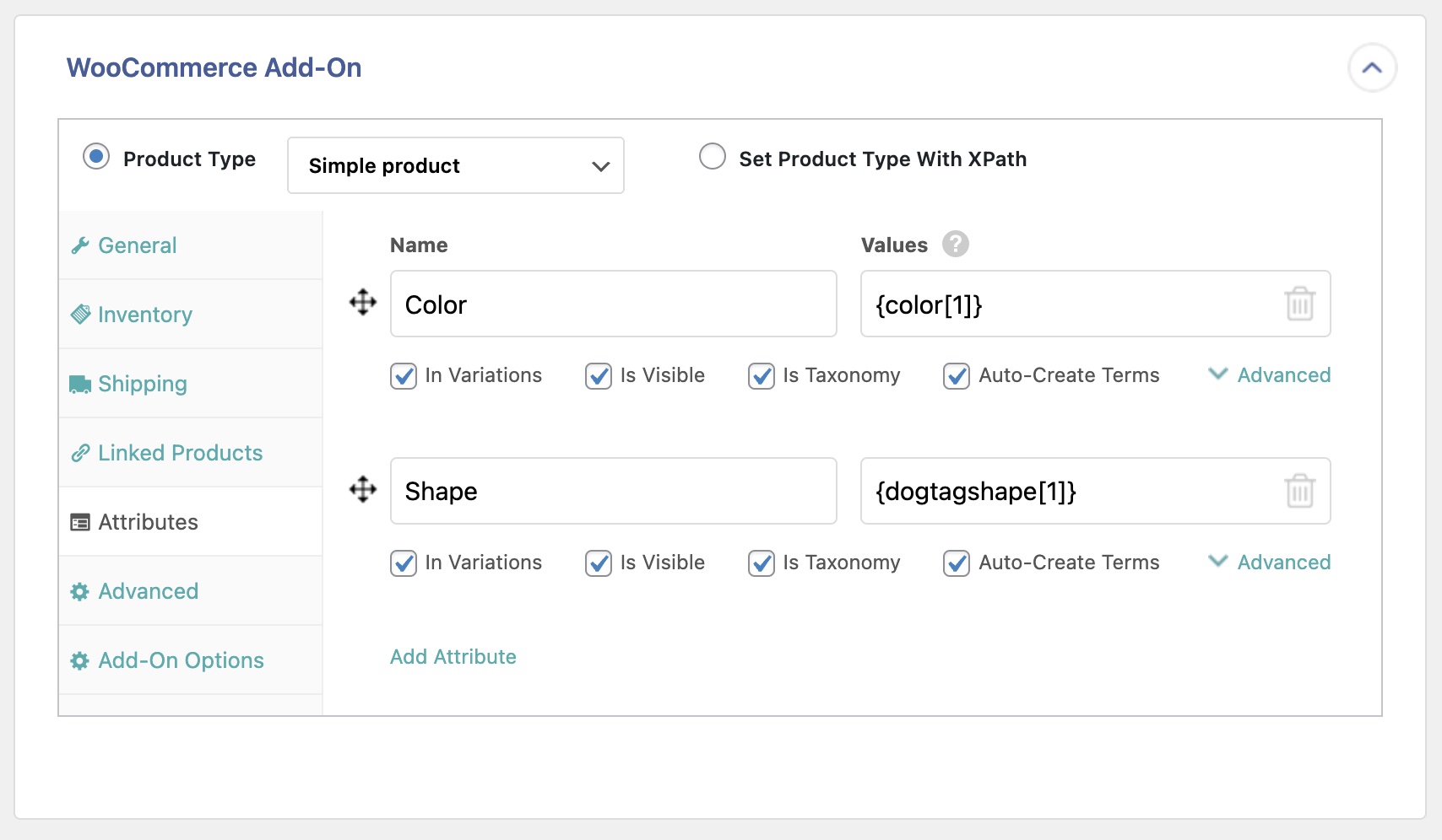 You can also use the attribute slug instead of the name to directly match with any existing attribute. For example, if your attribute slug is color-slug, you can match it like so: