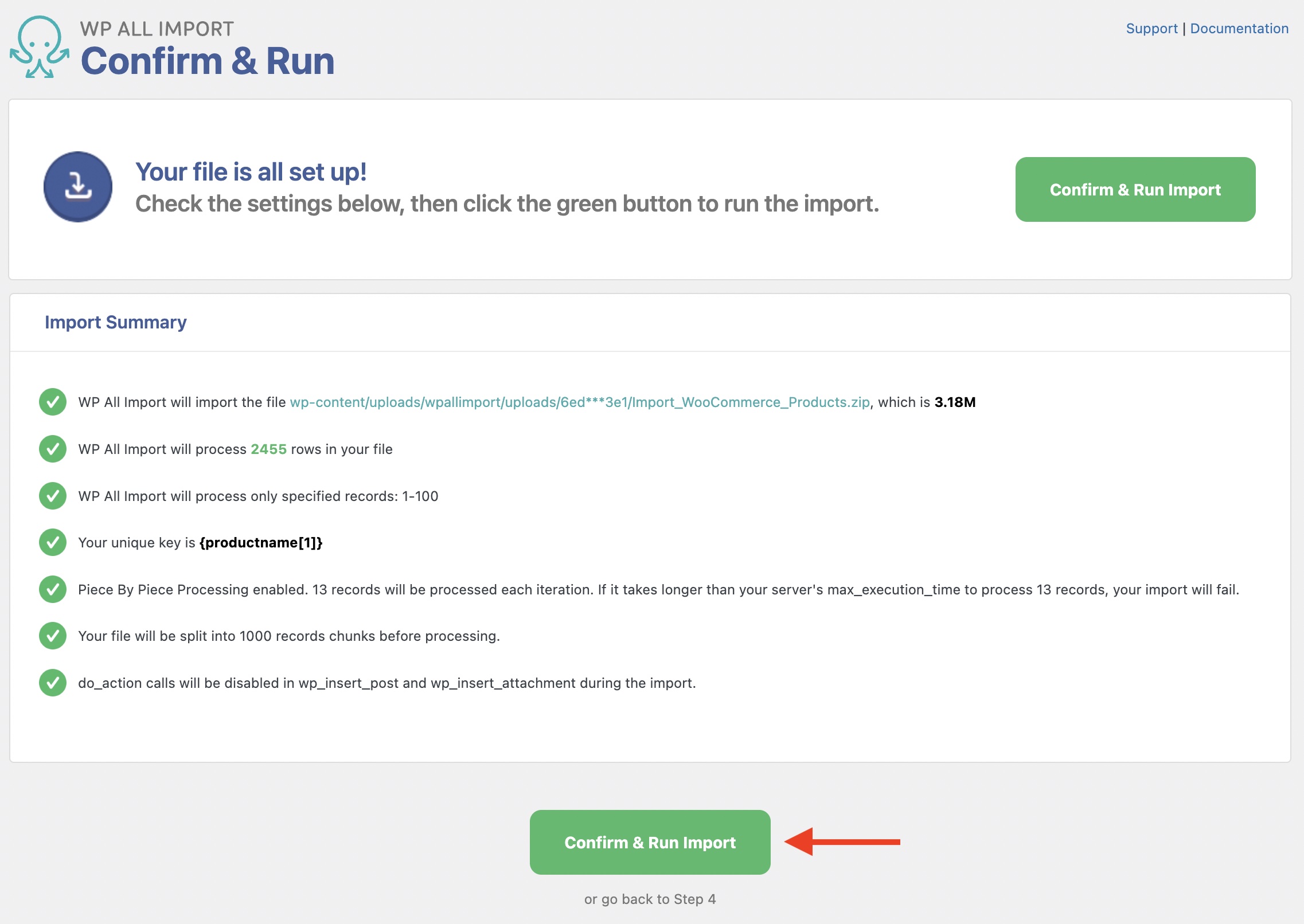 Before running the import, the Confirm & Run screen will appear, which lets you review the import summary.