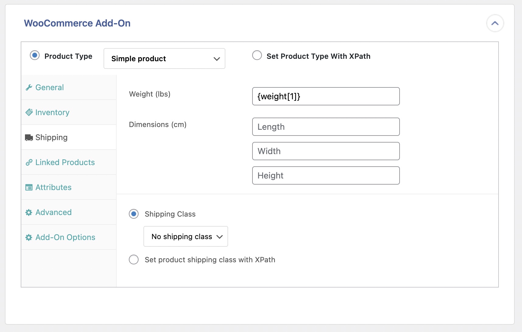 Next up is the Shipping tab, which lets you import the product's weight and dimensions along with the Shipping Class.