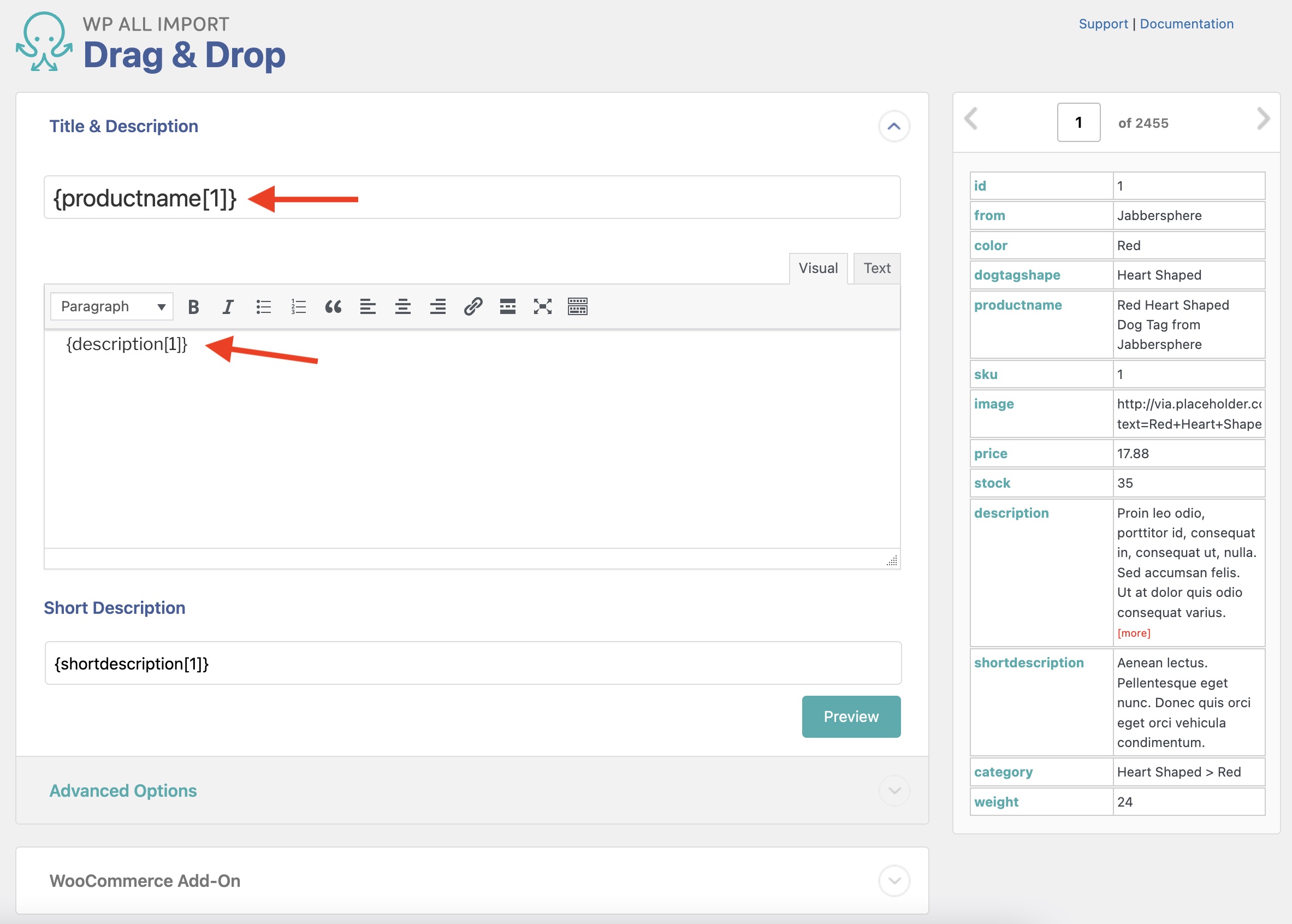 The Drag & Drop interface now appears, which lets you build the template to import WooCommerce products. To map the required fields, drag and drop the data elements from the panel on the right to the appropriate import fields on the left.