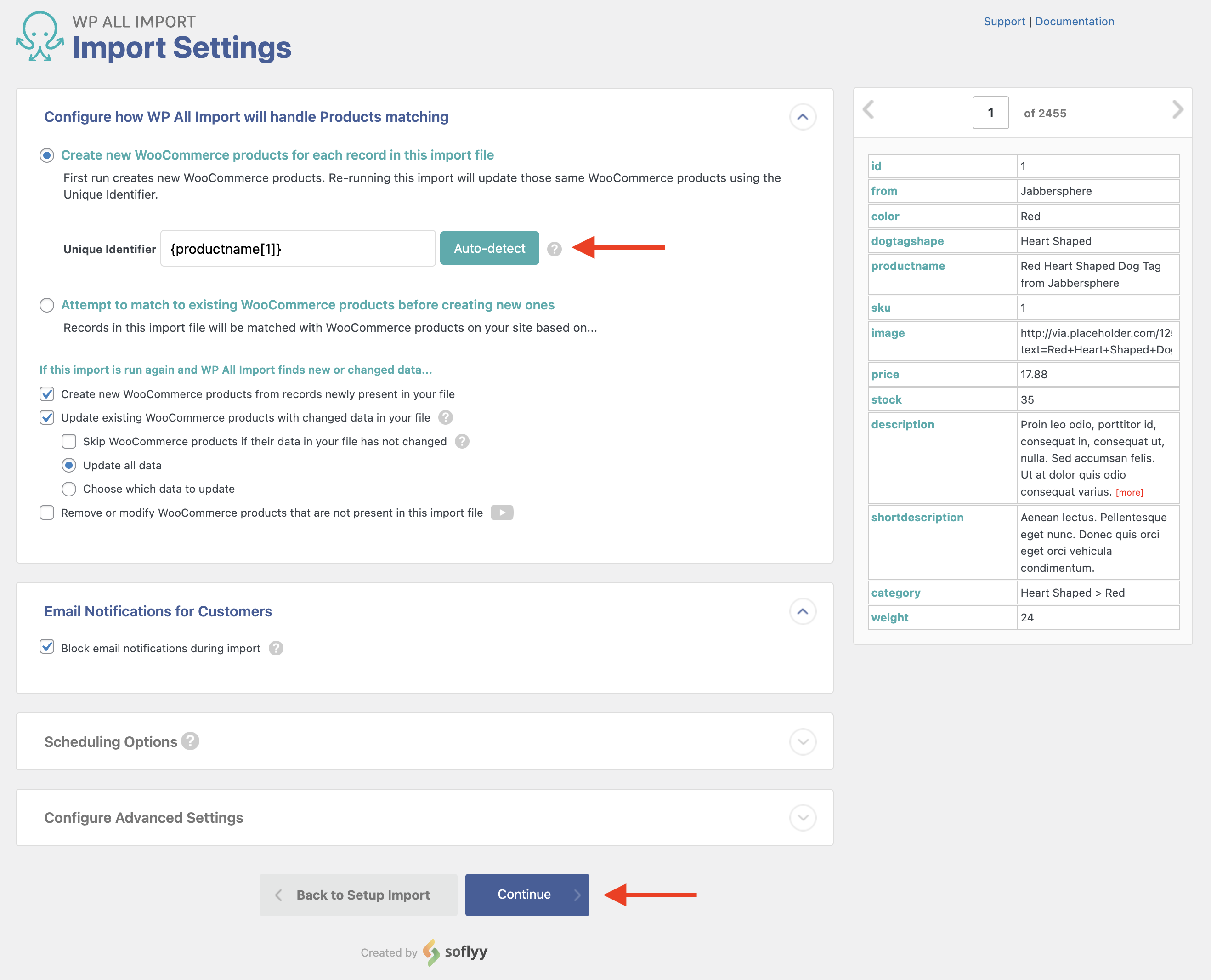 Now the Import Settings interface appears, where you can modify the import configurations. First, proceed to click on Auto-detect to automatically generate a unique identifier for your product's import.