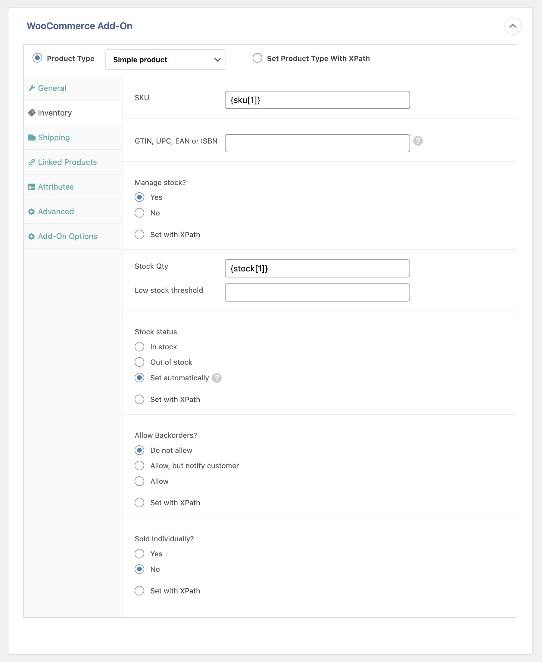 instock,outofstock,onbackorder. - Allow Backorders?: Used to enable or disable backorders in the product. Do not allow is set by default. You can also select Allow, but notify customer and Allow. The Set with XPath option accepts the values: