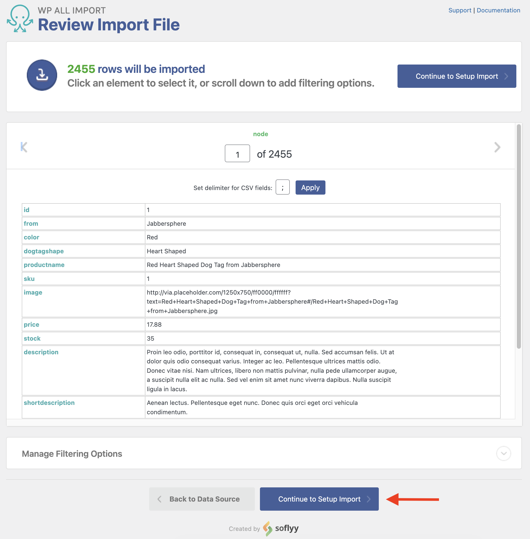 If you're importing a CSV or Google Sheets file, you can set a different delimiter for the fields. If you're importing an XML or Excel file, you can choose which parent node to use in the import process.