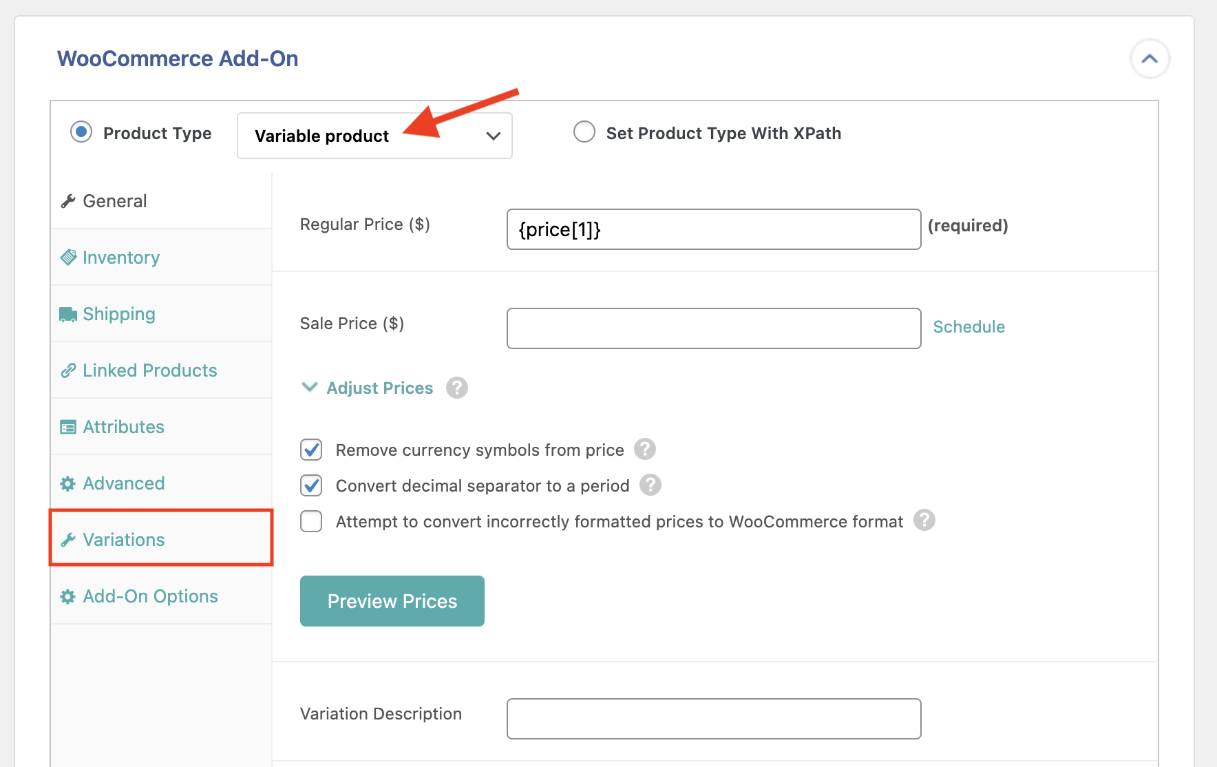 To import WooCommerce variable products, follow the steps above but choose Variable product as the Product Type. This will enable the Variations tab, which lets you configure and import variable products.