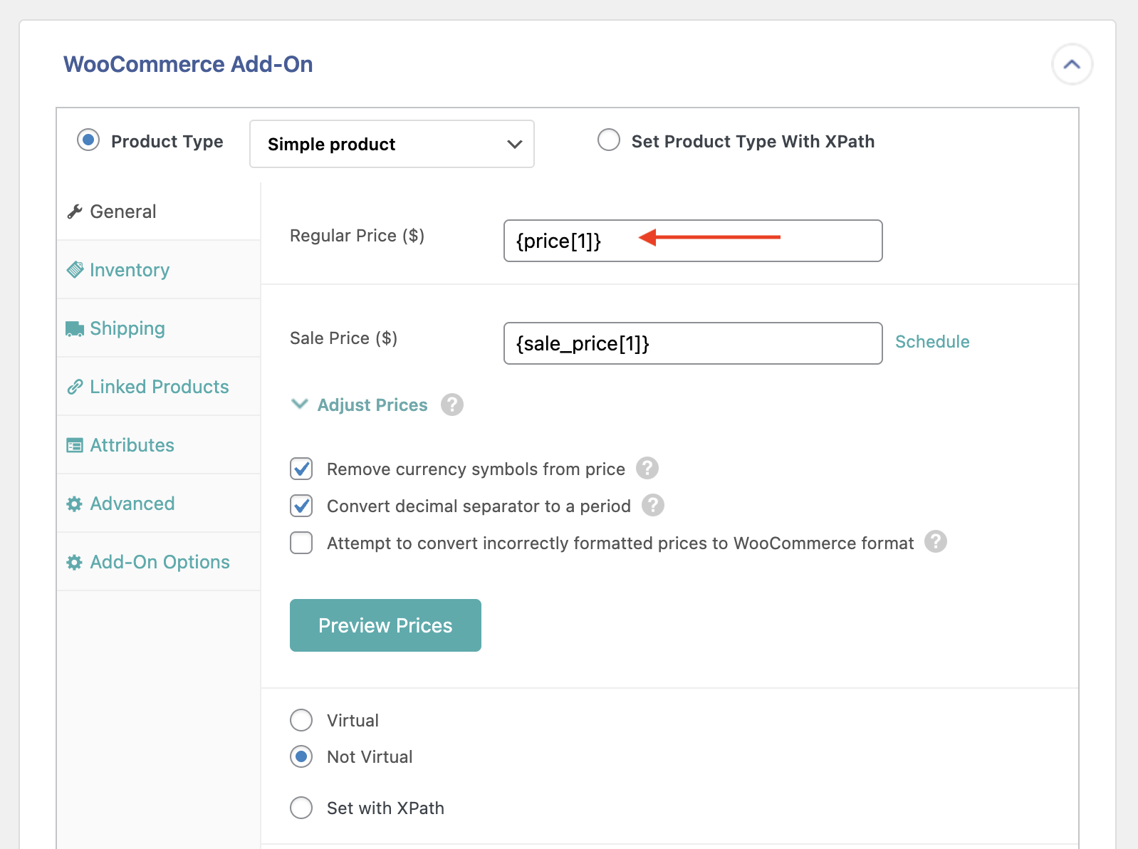 Locate the WooCommerce Add-On section and specify the new product price in the General tab:
