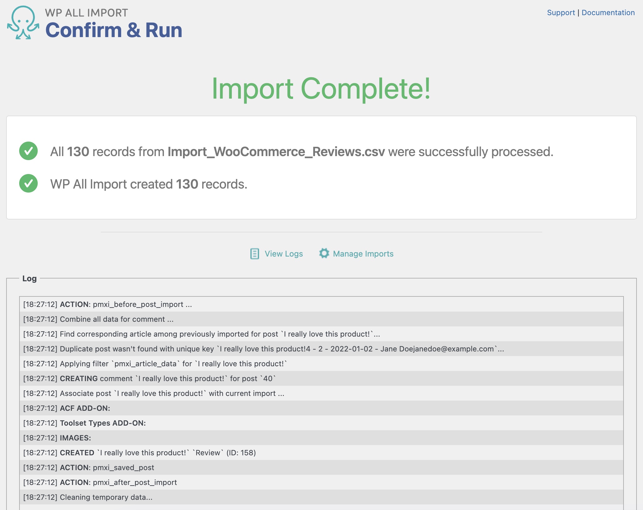 As long as everything looks correct, click on Confirm & Run Import to execute the import. This is the screen you'll see once the import is done: