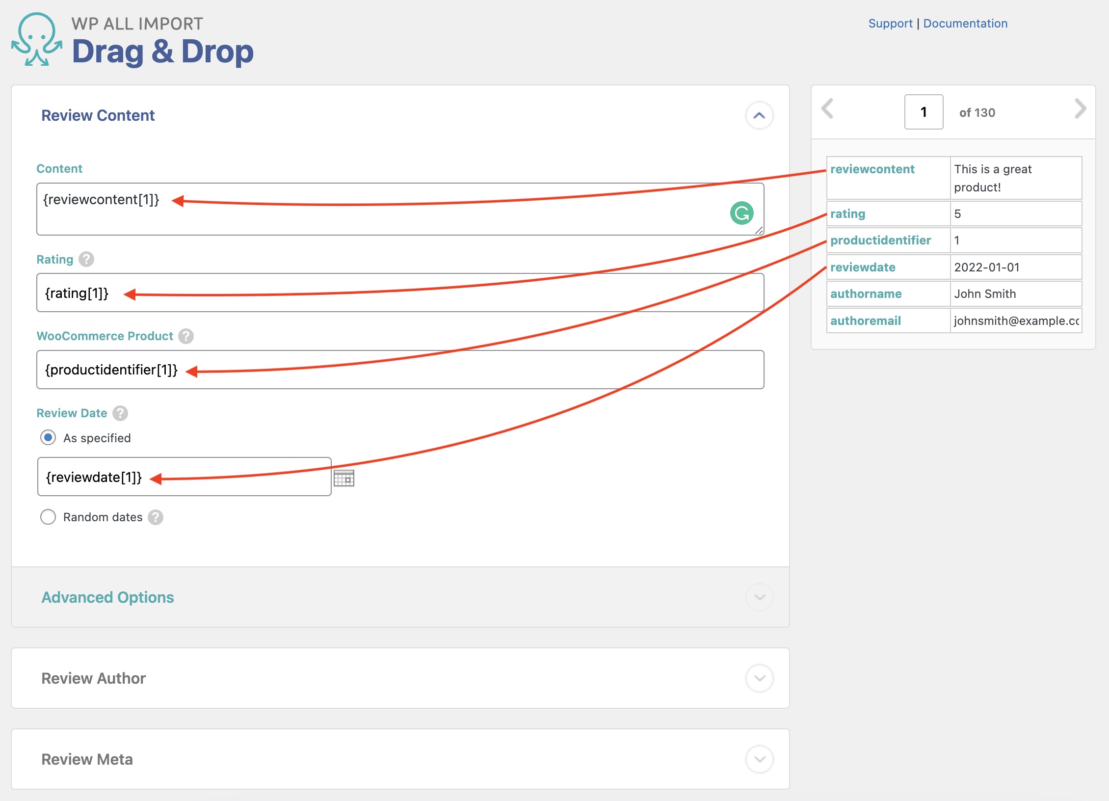 You'll now see the Drag & Drop interface, which lets you map the data elements from your import file to the WooCommerce reviews target fields. To do this, just drag the data elements from the right to the target fields on the left.