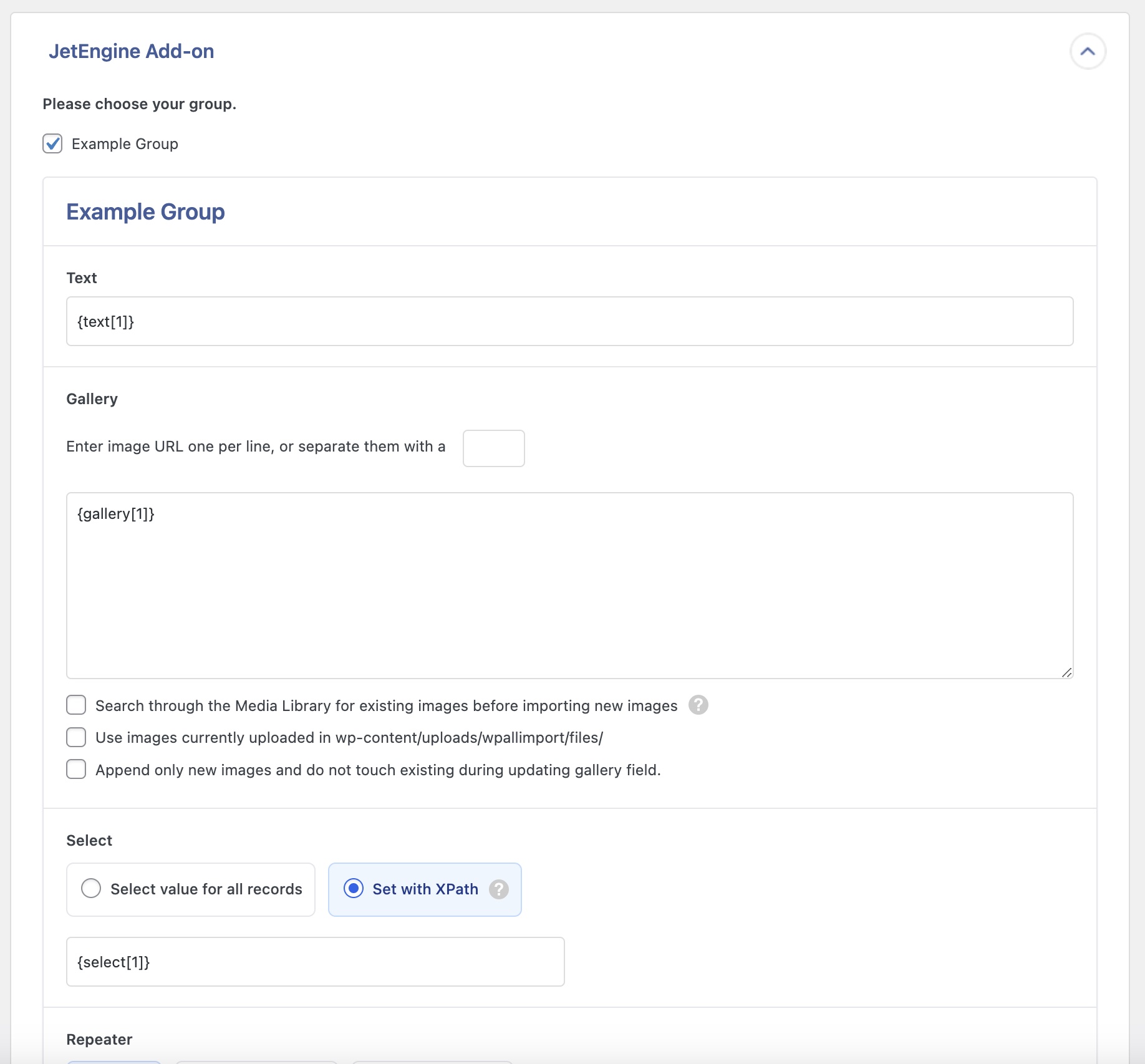 Enable the groups where you want to import the JetEngine fields, then map each field as required. For example, here are some example JetEngine fields: