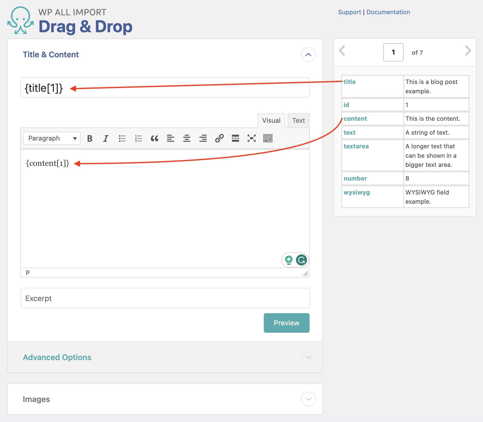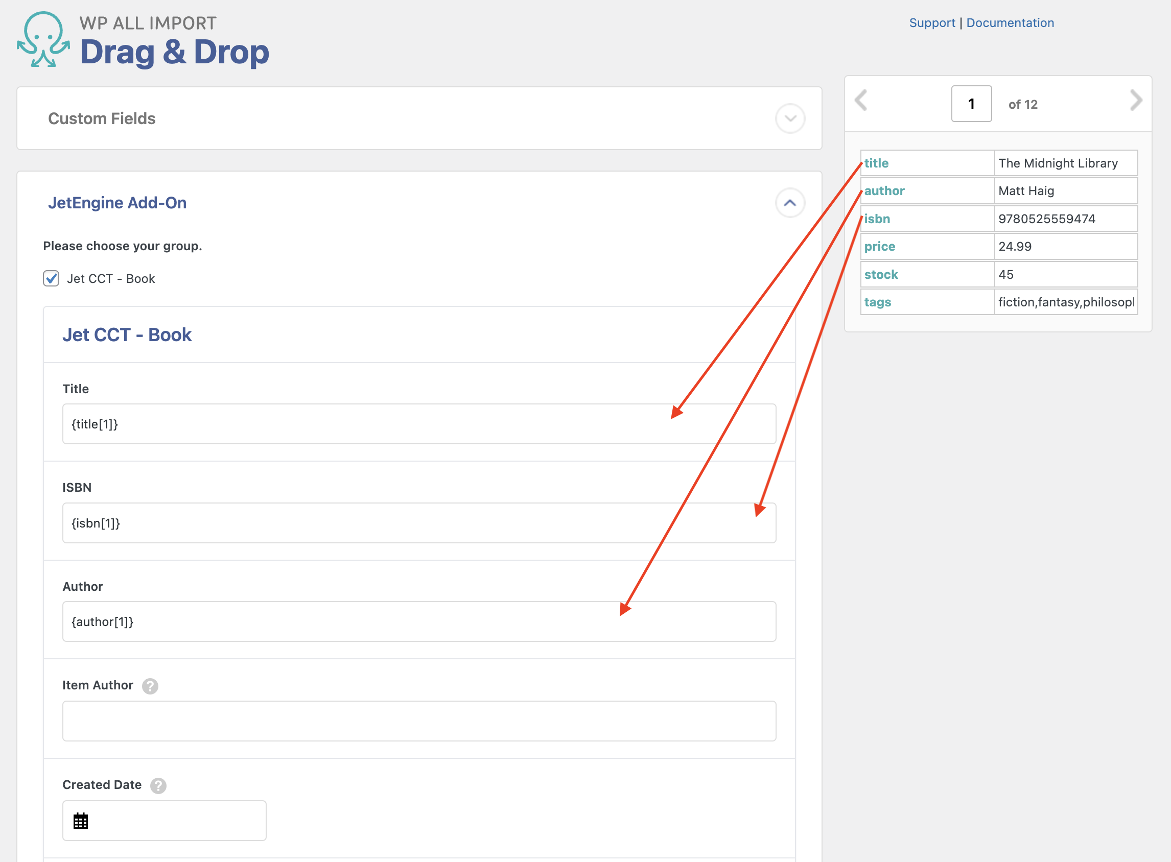 The Drag & Drop screen lets you map the import elements to their respective target fields on your site.