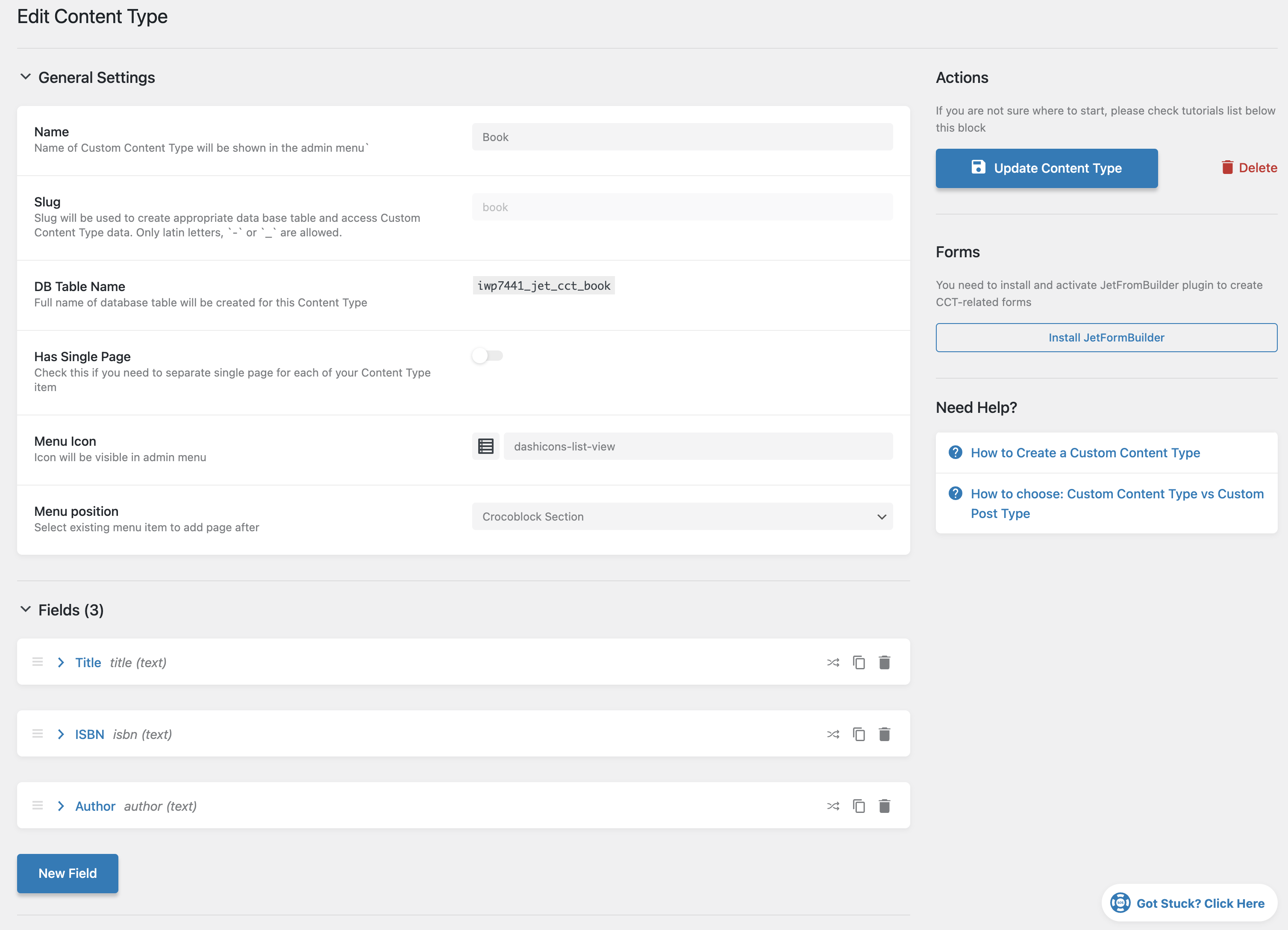 For example, you might use a CCT to store employee records, event bookings, or product specifications that need their own unique structure. Each CCT can have multiple fields of various types (text, number, date, etc.) and can be related to other WordPress content or other CCTs through relationship fields. Here's an example of Book CCT: