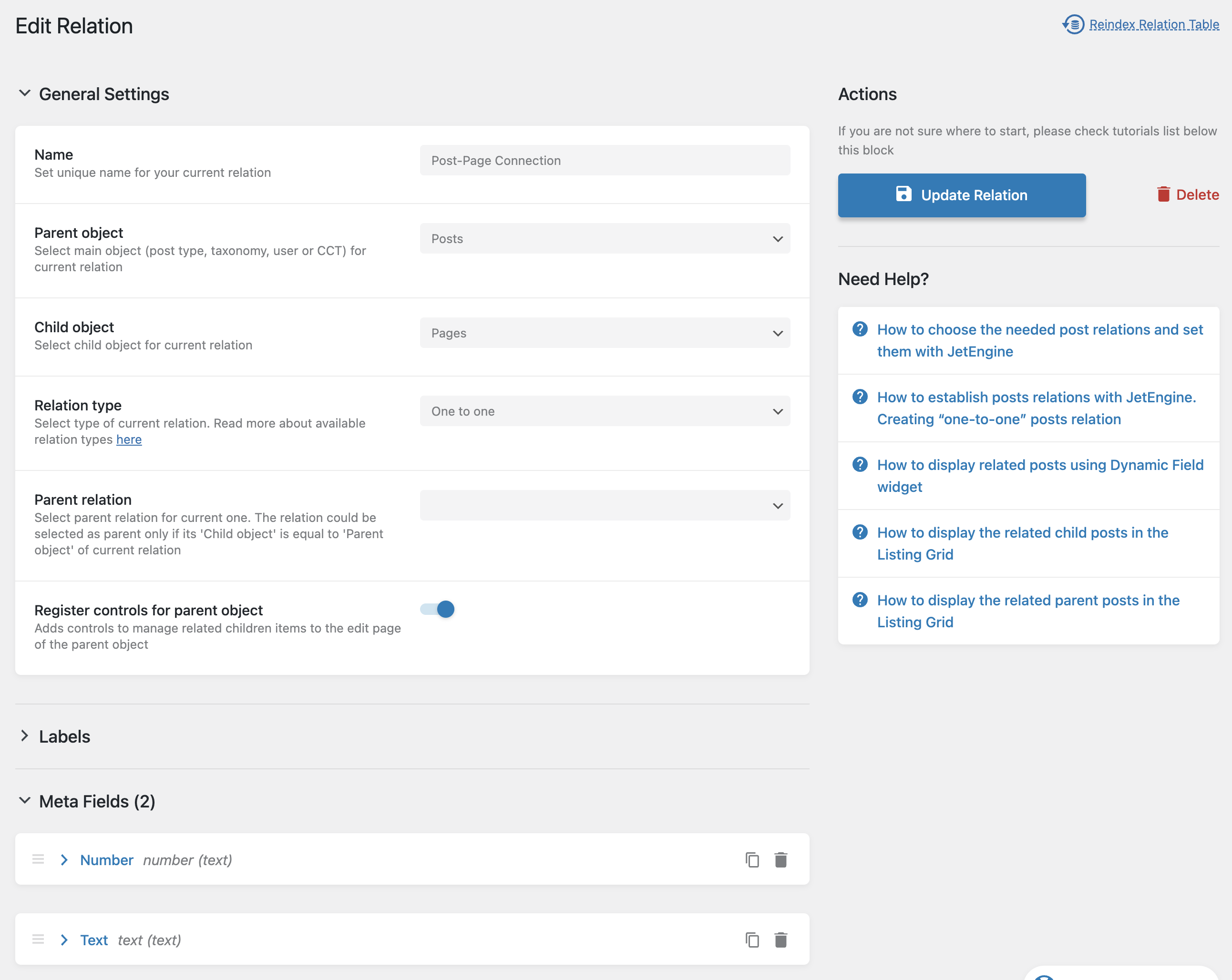 For example, you might want to connect Products to their Manufacturers, or Courses to their Instructors. Instead of duplicating this information across multiple posts, Relations create a direct link between them. This makes it easier to manage and display related content throughout your site, and ensures your data stays consistent when information changes.