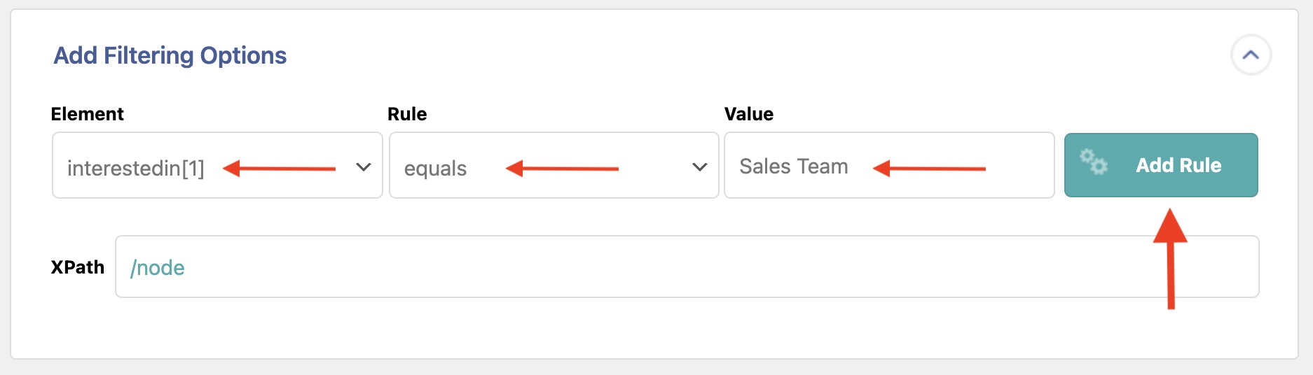 This means, “Import only Gravity Forms entries where the field 'Interested In' equals 'Sales Team'."