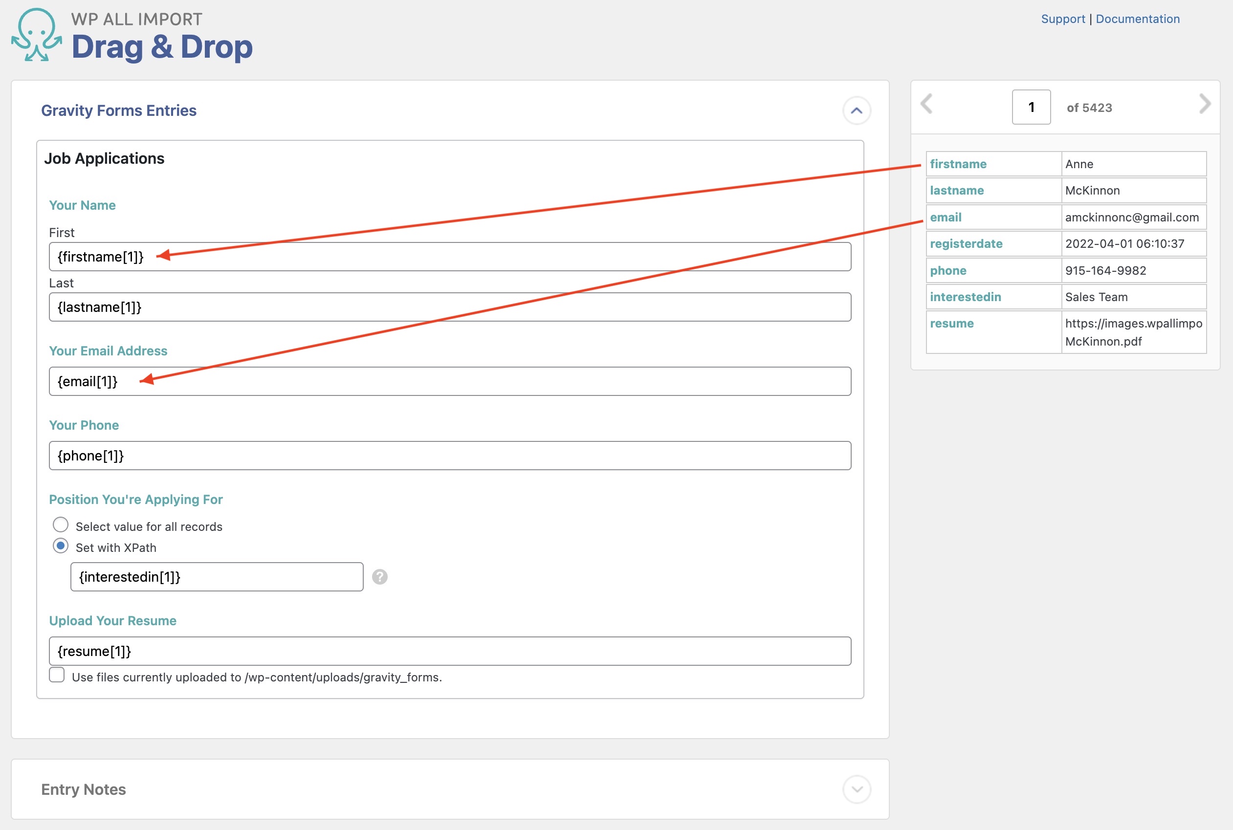 The Drag & Drop interface will appear. You can map all of your entry data under the Gravity Forms Entries section. In this case, since we're importing Job Applications, you'll see the fields for that form: