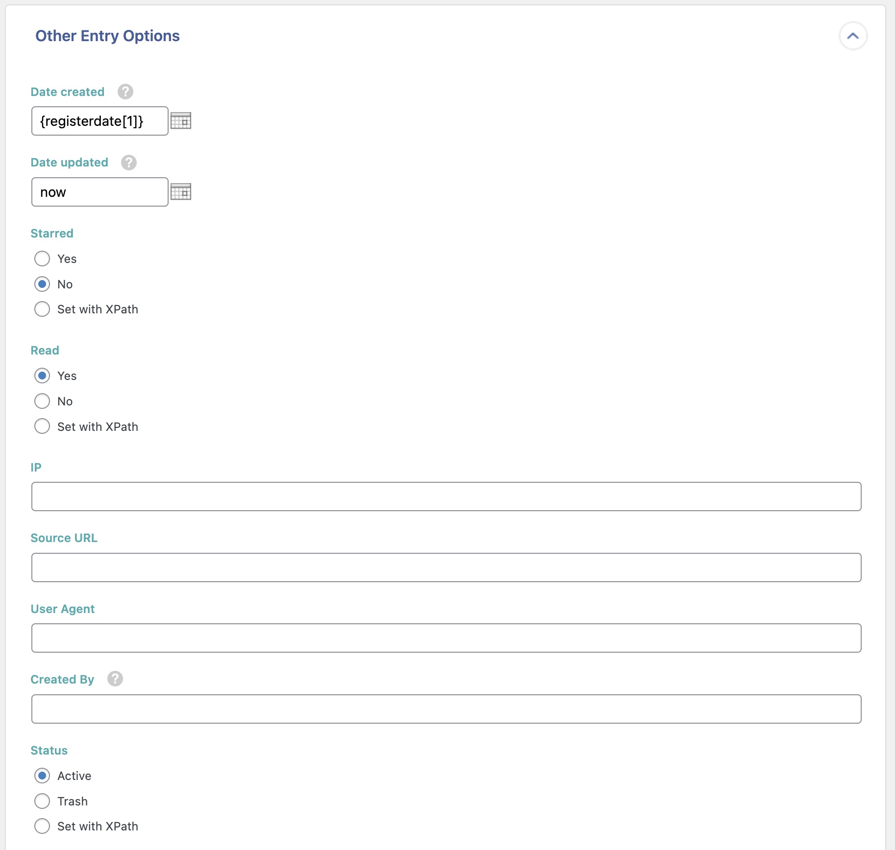 Finally, the Other Entry Options section lets you import the date when the entry was made, along with metadata about each imported entry (such as who created it, if it's been read, its status, etc.):